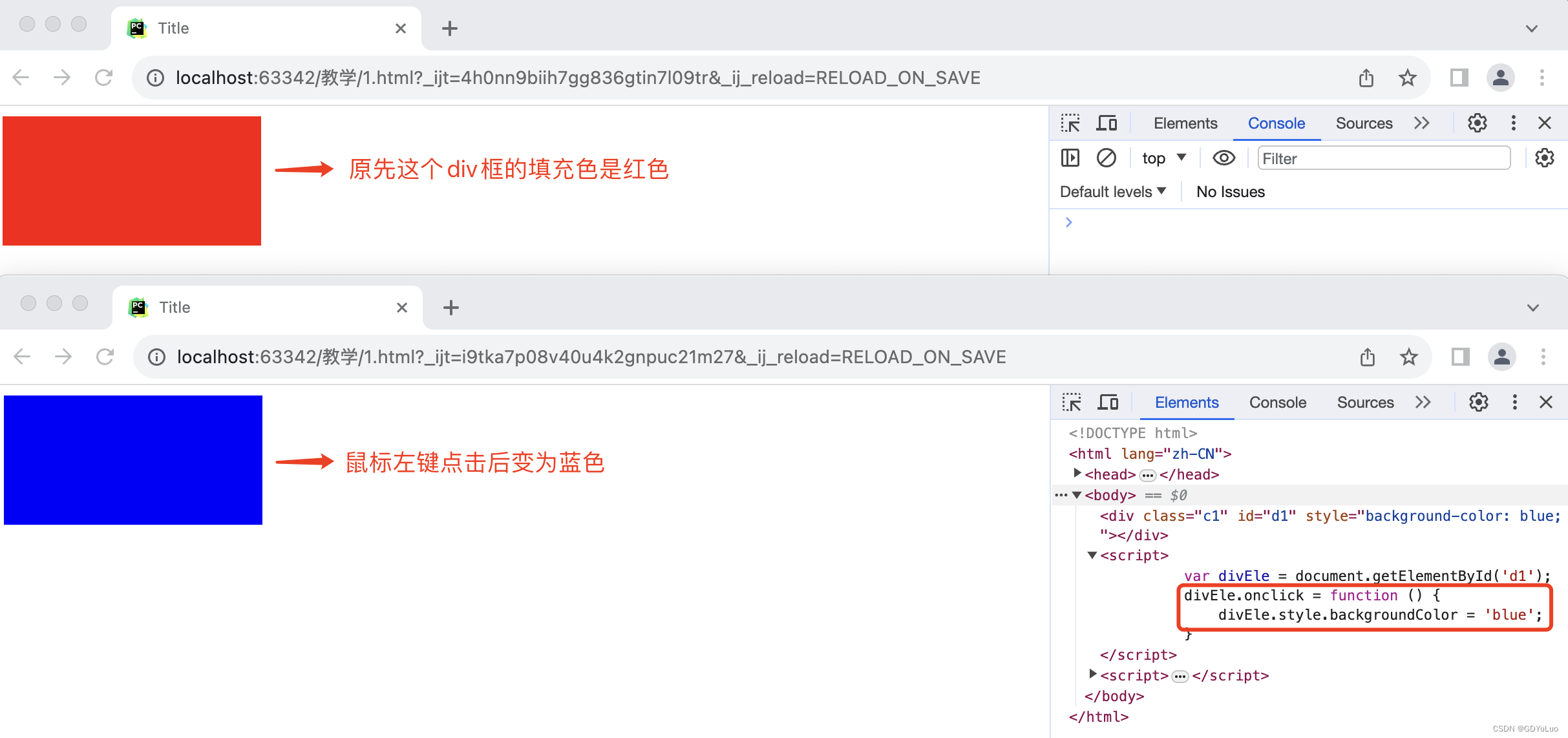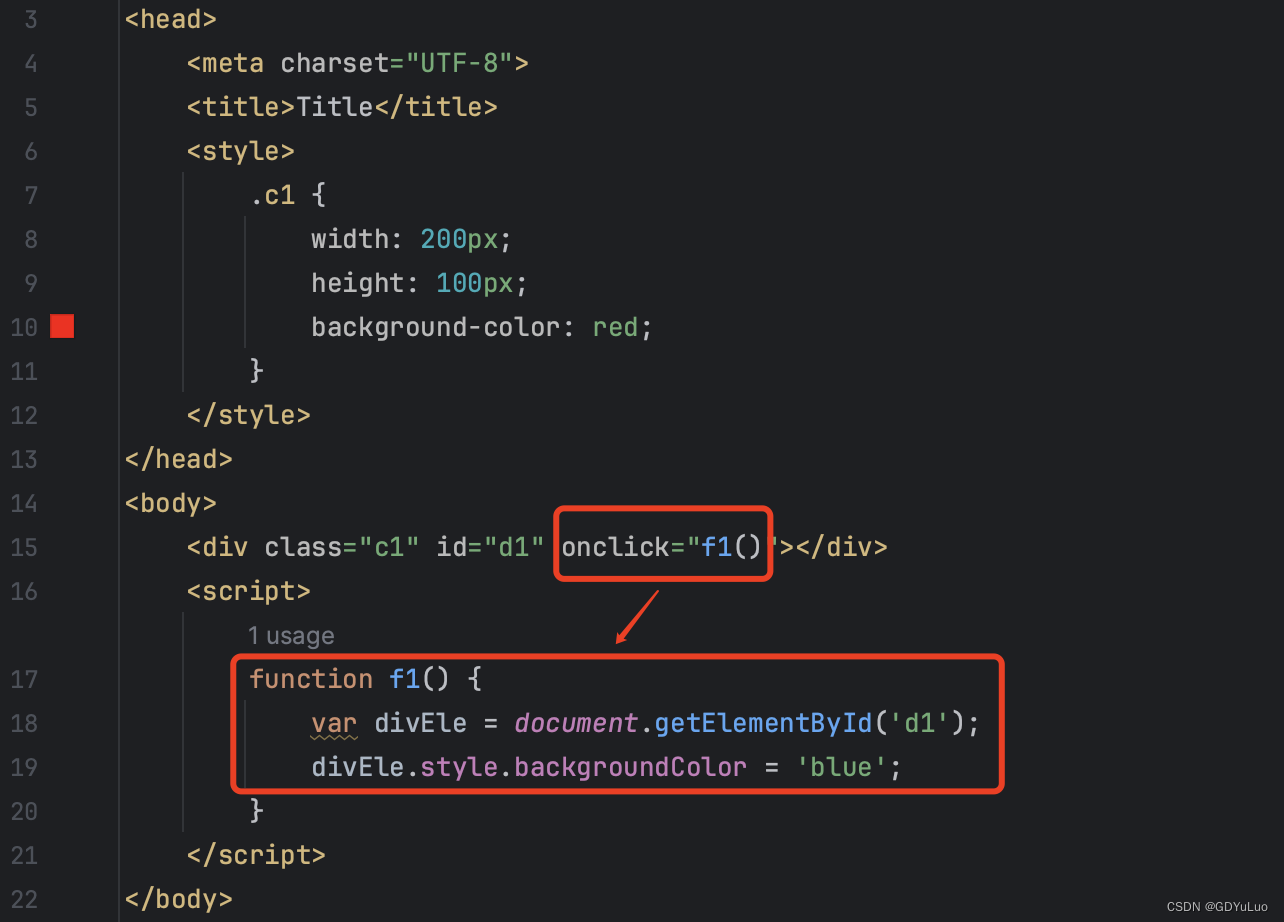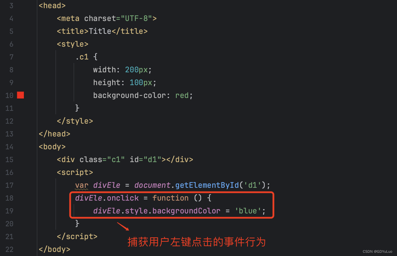 我们现在HTML中写入以下内容:先设置一个200x100的红色div框框,再设置一个鼠标左键点击事件,当鼠标左键点击这个div框框,框框的填充色由红色变为蓝色
