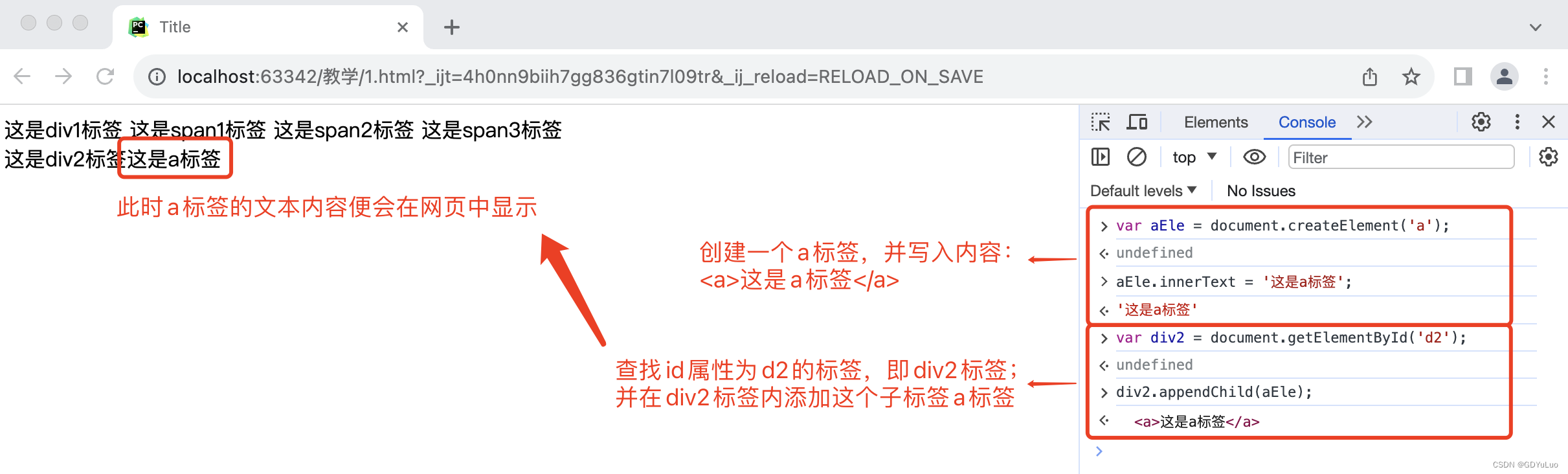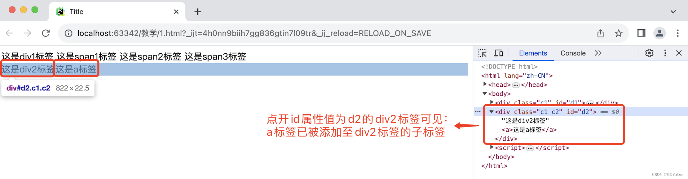 这样a标签及内容就会被插入d标签的子标签内部,作为最后一个子标签节点。例如我们看下面这个案例,首先写好一个HTML文件,我想创建一个a标签,并把它插入到div2标签的子标签里