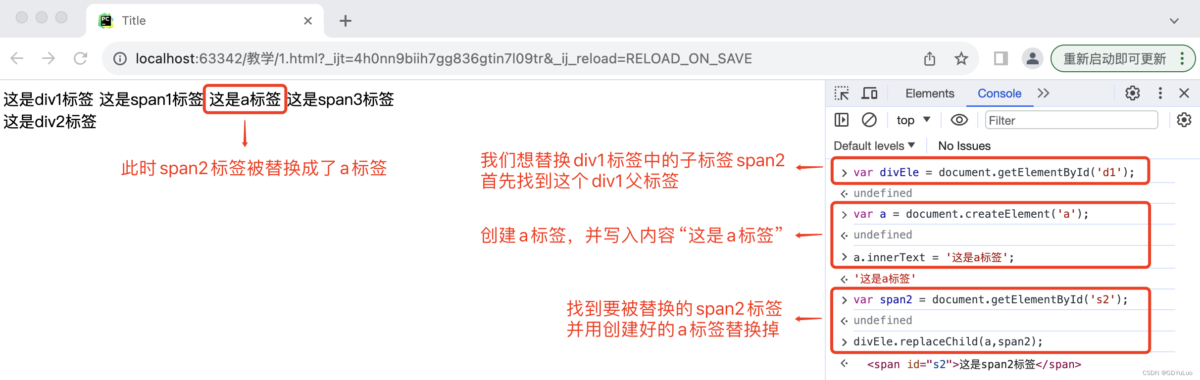 这样d标签的子标签d1标签及内容就会被a标签所替换。例如我们看下面这个案例,首先写好一个HTML文件,我想创建一个a标签来替换原有的span2标签,首先我要找到它的父级标签,也就是div1标签,再找span2标签进行替换