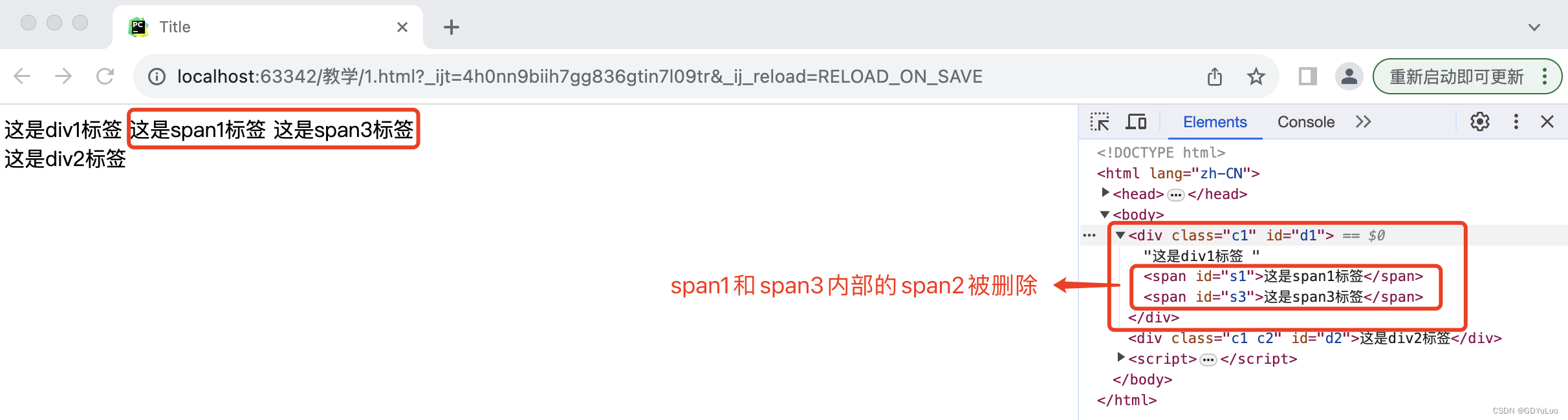 这样d1标签及内容就会被删除。例如我们看下面这个案例,首先写好一个HTML文件,我想创建这个span2标签,首先我要找到它的父级标签,也就是div1标签,再找span2标签进行删除