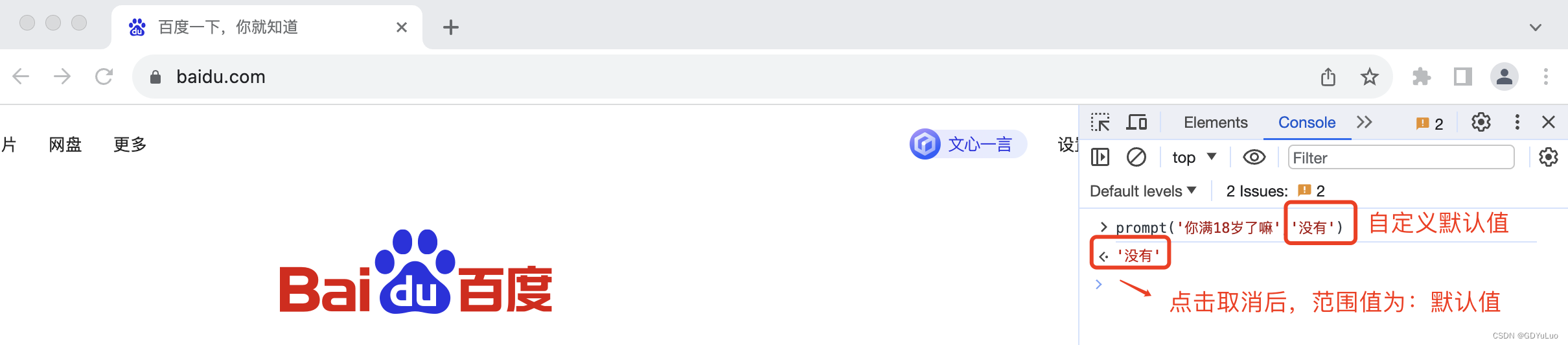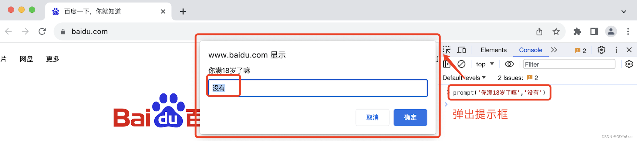 提示框经常用于提示用户在进入页面前输入某个值。当提示框出现后,用户需要输入某个值,然后点击确认或取消按钮才能继续操作。如果用户点击确认,那么返回值为输入的值。如果用户点击取消,那么返回值为默认值,也就是下方自定义的message2,如果没有默认值那么返回null