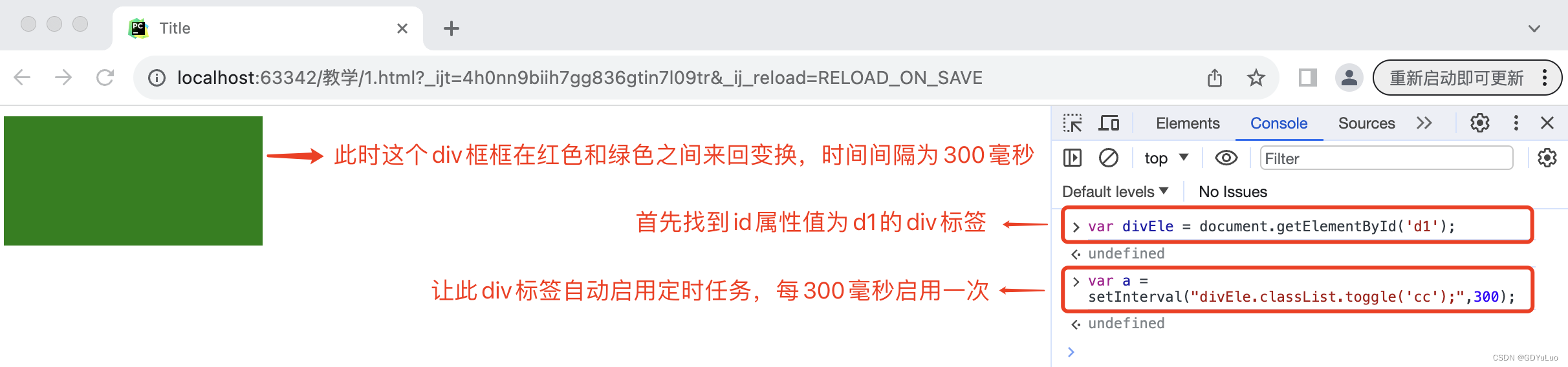 classList.toggle(cls) :存在该类属性值就删除并返回false,否则就添加上并返回true。那我们启用一个定时任务,反复执行toggle,反复增加和删除该标签内的class类属性值,通过显示不同的style样式,那就可以做到来回切换标签的展示效果