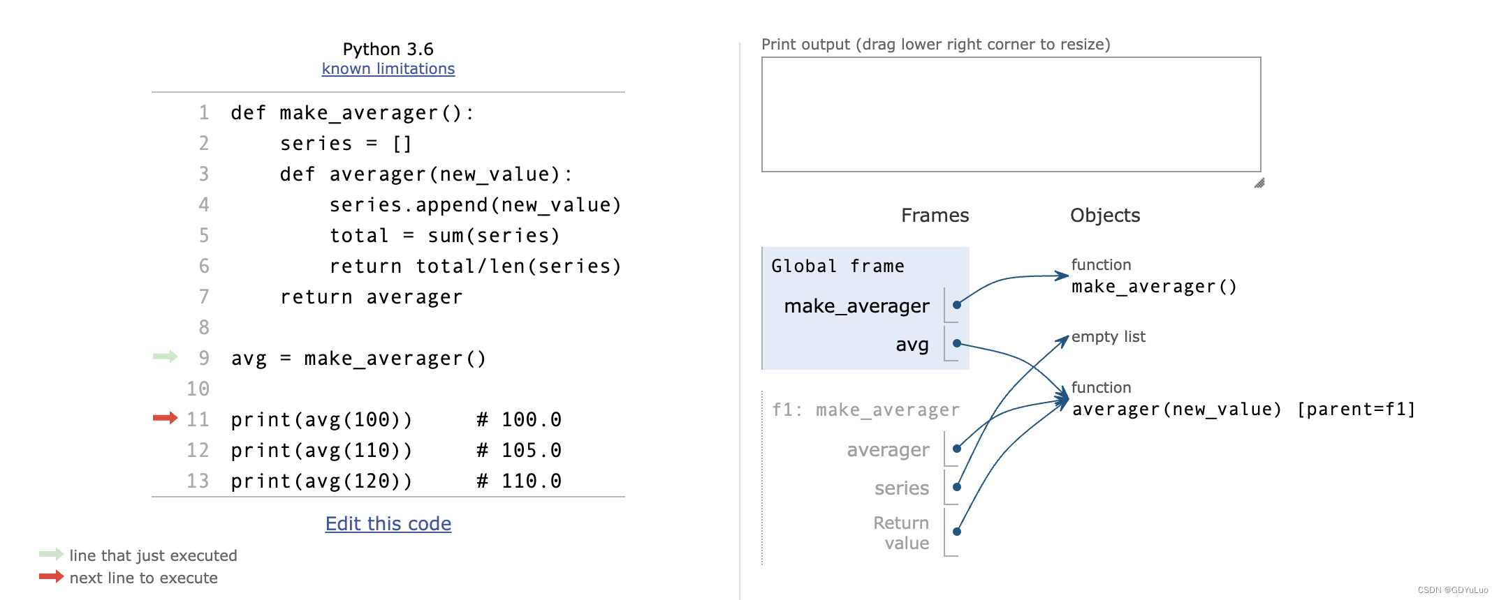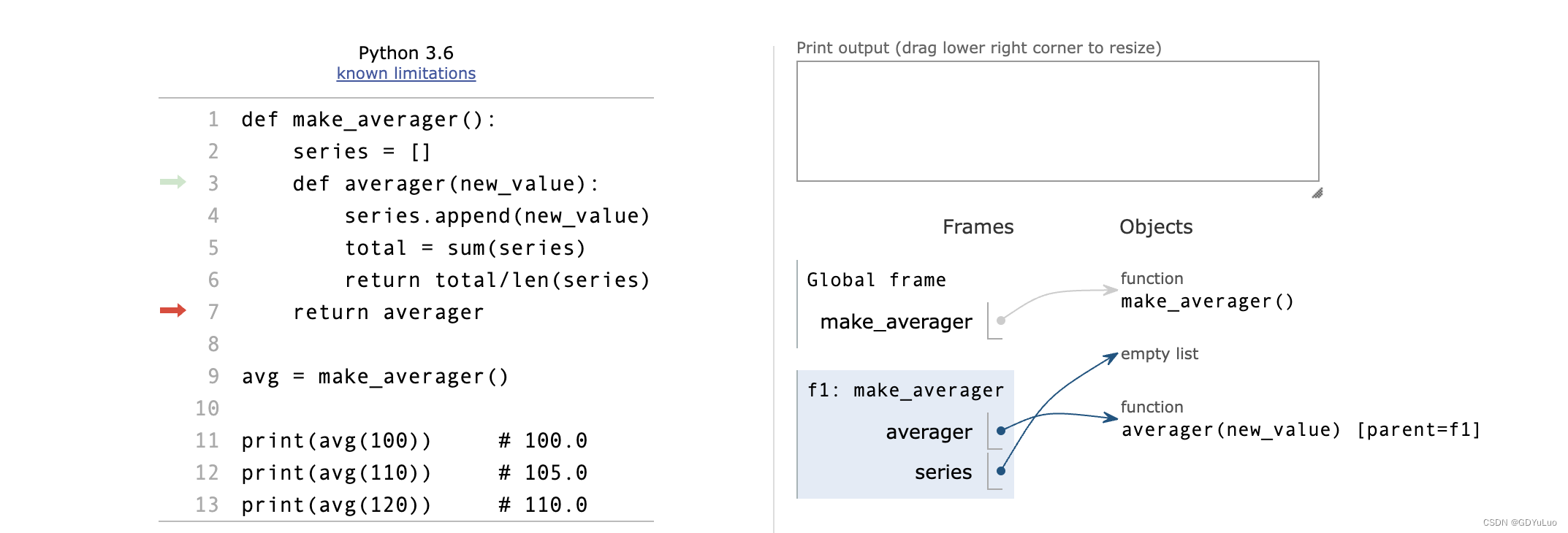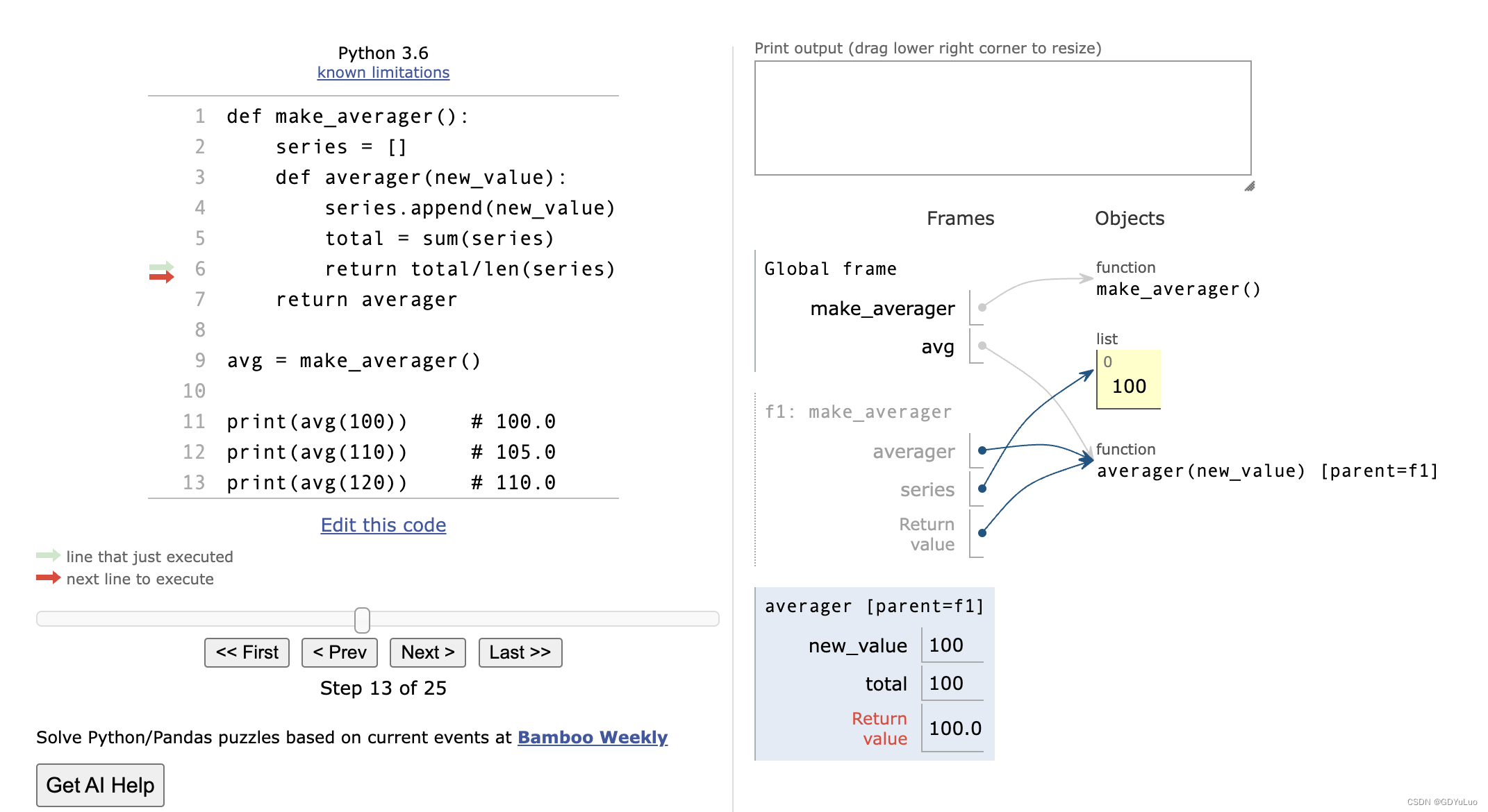 ② 因为avg=make_averager(),因此执行avg(100),相当于执行了make_averager()函数,从而执行averager(new_value)函数,并将值100传给了new_value,添加进series = []空列表,相当于此时series = [100],此时的total=100,列表的len为1,并返回total/len(series),即100/1=100,得出结果为100.0