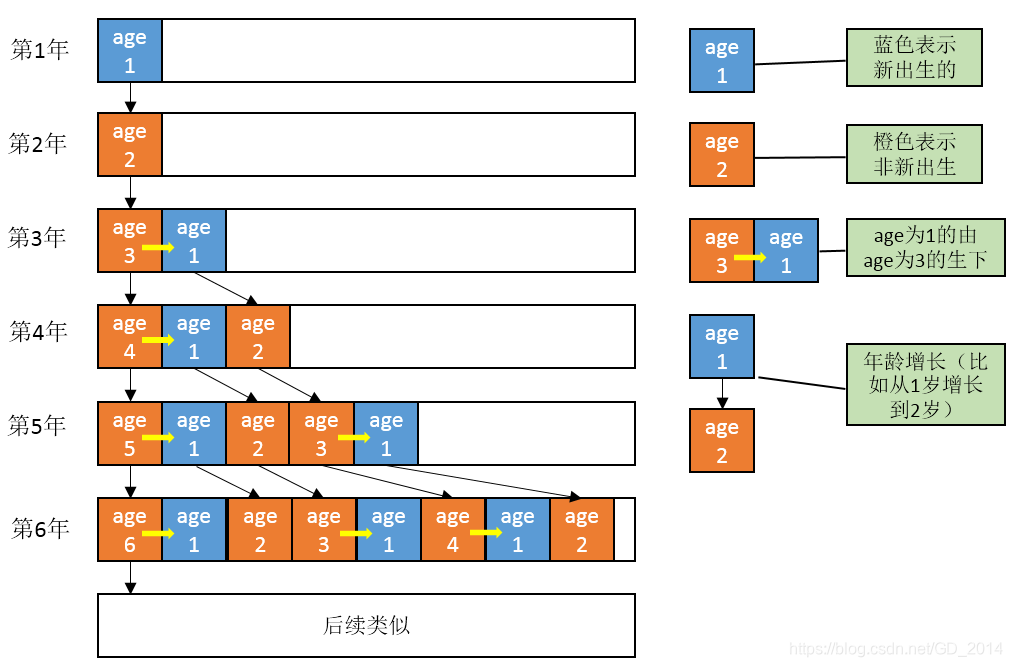 - 第1~2年,不生小牛,所以年龄会增加,但是牛的个数不变(cows.set(牛的编号,age+1));