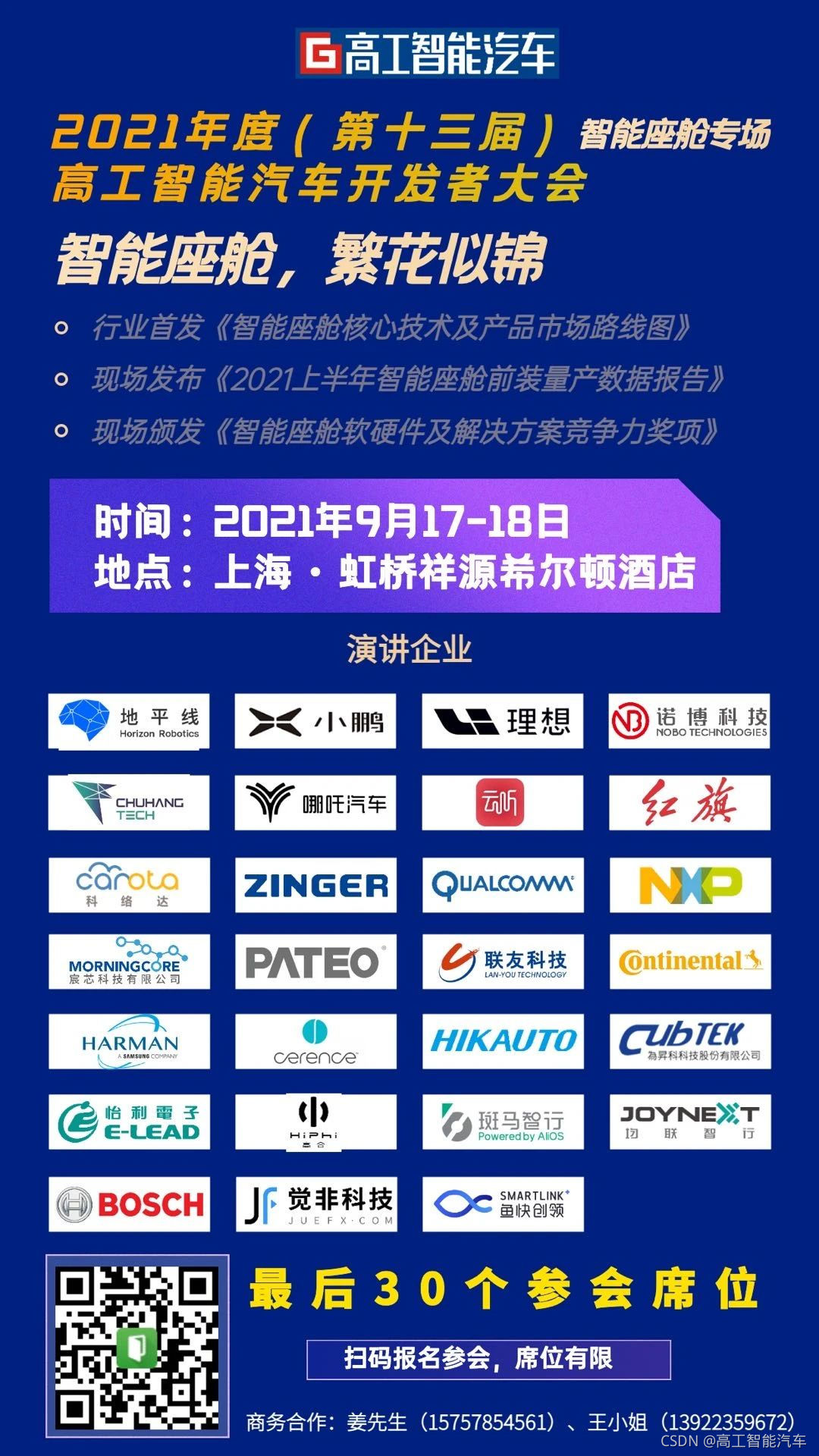 第十三届高工智能汽车开发者大会座舱车联专场仅剩11天,目前仅剩最后20个参会名额。