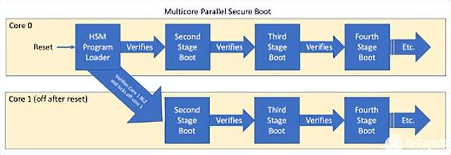 像汽车芯片这种大型的SoC一般是多核系统,多核系统的启动可由BootROM校验下一级bootloader并由该bootloader加载不同核的一级bootloader,再由一级bootloader开始连续校验下面的镜像内容。