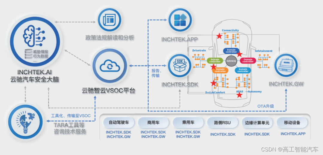 而云驰未来推出的车联网安全中间件则是面向未来的、集中式电子电气架构设计的信息安全软件框架,可以被集成到域控系统中,为各个车内的域控系统(如动力域、底盘域、自动驾驶域等)提供安全能力。