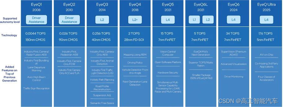 今年初,Mobileye宣布推出下一代SoC,包括EyeQ®6 Lite and EyeQ®6 High,基于7nm FinFET工艺,可以满足行泊一体的需求;EyeQ Ultra™则是基于5nm FinFET工艺,满足多感知融合的L4级自动驾驶需求,不过三款芯片最快要到2024年才具备车规级量产能力。