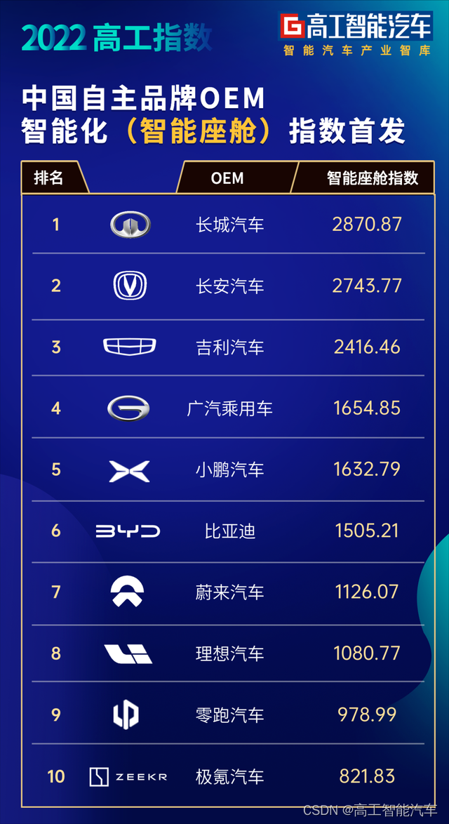 在10月11日发布首个自主品牌OEM智能化指数的基础上,高工智能汽车研究院今天再次发布第二份细化指数,以联网智能座舱为统计口径,首次发布OEM的智能座舱指数。