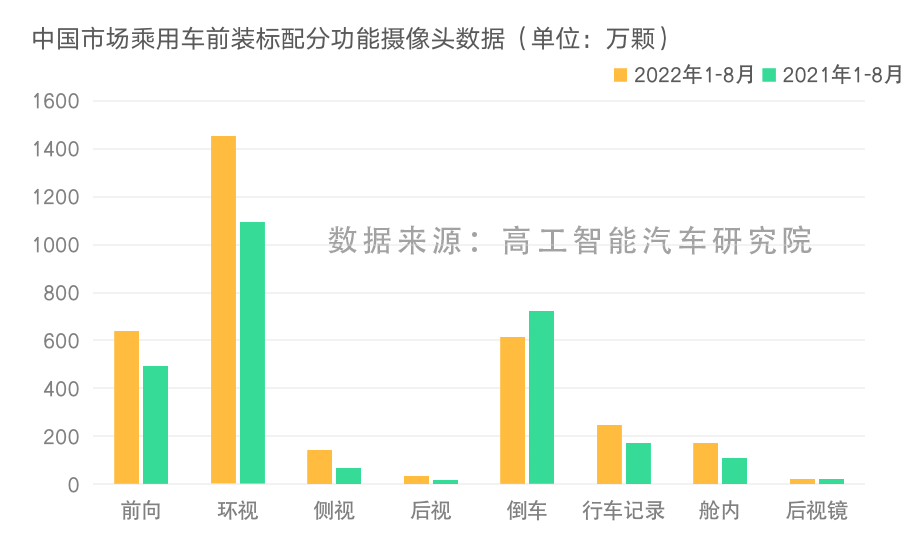 全景环视方面,今年1-8月中国市场(不含进出口)乘用车新车标配交付为1452.37万颗,同比增长32.94%;;而这个数字在2021年同期为73.17%。在功能配置方面,1-8月全景环视前装搭载率为29.14%,上年同期为20.72%。