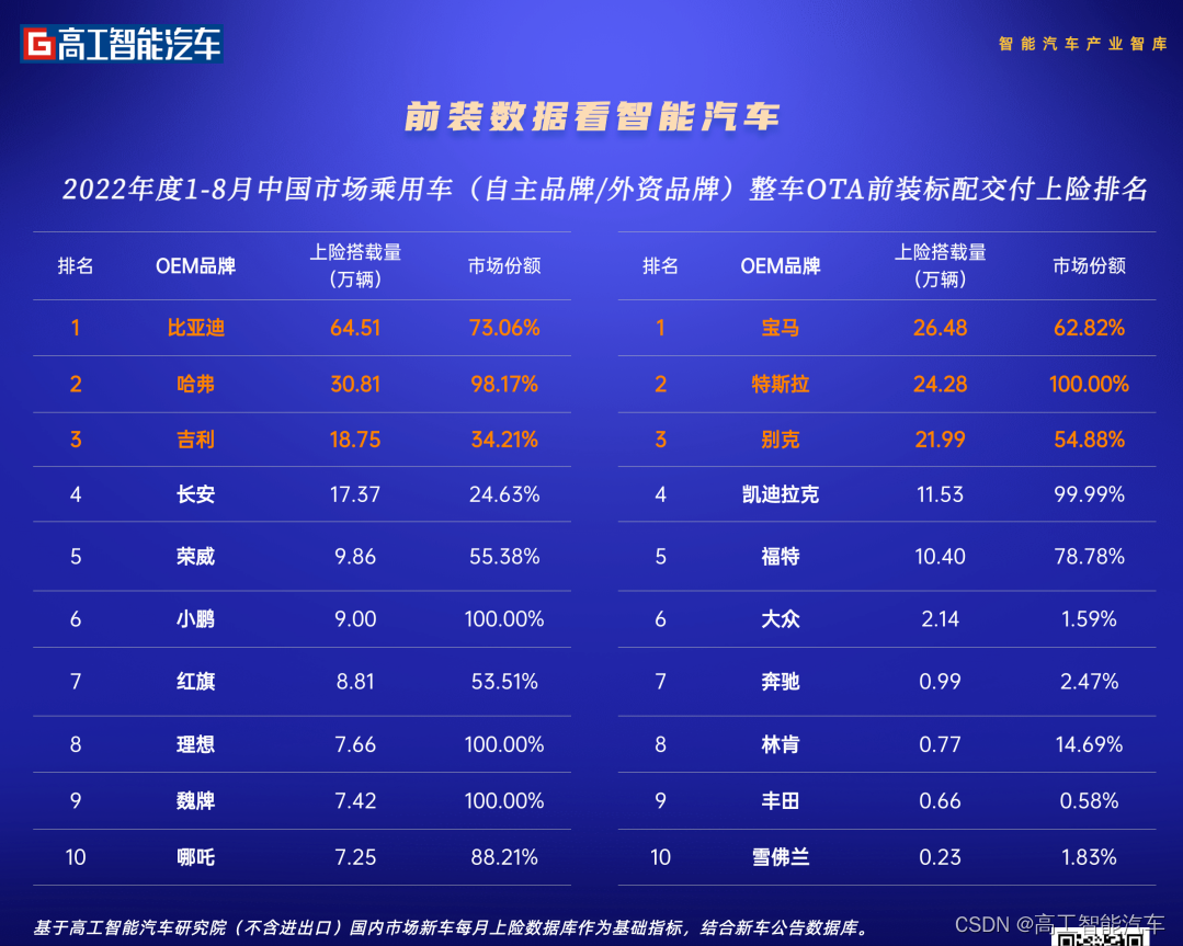 高工智能汽车研究院监测数据显示,2022年1-8月中国市场(不含进出口)乘用车前装标配搭载OTA功能交付上险为575.89万辆,同比增长27.33%,其中整车OTA交付上险为359.13万辆,同比增长54.05%;这意味着,汽车硬件升级(FOTA)正在成为继汽车软件升级(SOTA)后又一个高增长赛道。(更正:下图中的市场份额应为品牌搭载率)