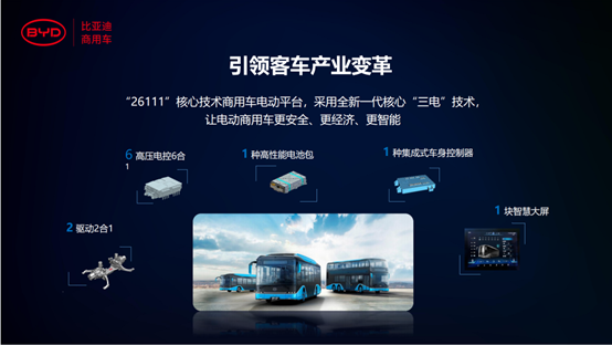 在新能源商用车市场,比亚迪几年前便推出了“26111”为核心技术的全新电动商用车平台,实现了新能源商用车生产制造的高集成化和高标准化,并持续不断地将更多创新的技术应用于商用车产品,实现了更安全、更经济、更智能以及更高效、更可靠的核心竞争力。