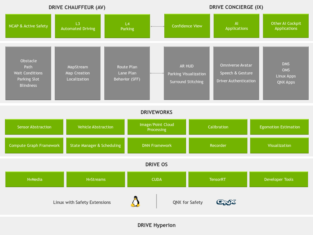 而CUDA也是DRIVE® OS很关键模块,在此之上,就是NVIDIA®DriveWorks SDK,英伟达自研的自动驾驶汽车软件开发中间件。包括车辆传感器的接口,处理传感器数据作为感知算法的输入,以及在预先训练的网络上执行DNN推理。