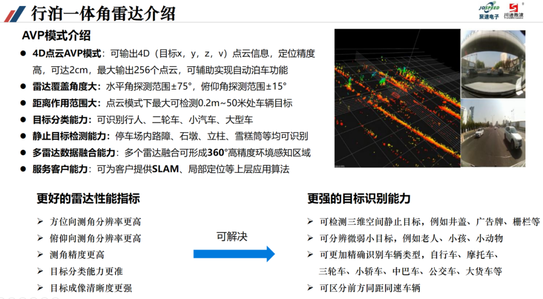 另外值得一提的是,得益于4D点云技术的增强,角雷达赛道也进入了全新的替代升级周期。聚速电子目前已经推出了行泊一体AVP角雷达,可以充分满足多重应用场景的复杂度要求,并且通过4D点云输出、Freespace、深度学习目标识别等方式的融合,解决了多种复杂场景的痛点难题。