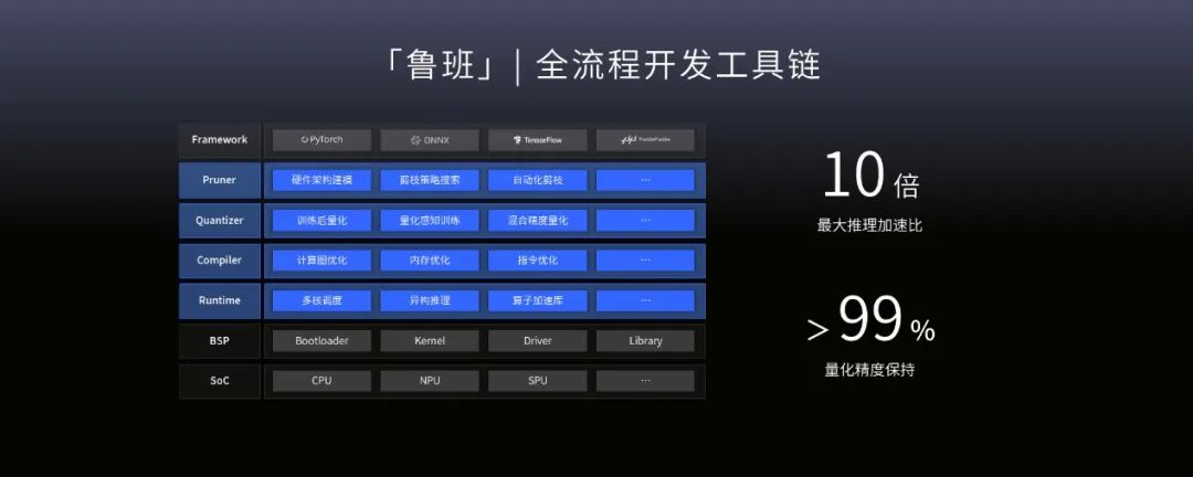为支持智能驾驶应用在惊蛰R1芯片上高效便捷的部署和运行,超星未来配套推出了全流程开发工具链「鲁班」,提供包括剪枝工具、量化工具、编译器和运行时在内的全套软件开发工具,支持Pytorch、TensorFlow等主流深度学习框架。