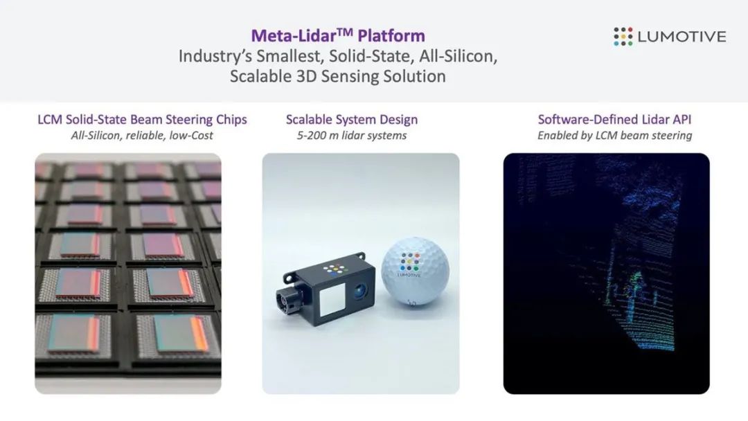 而Lumotive的方案,开创性地基于独特的LCOS定制工艺,将半导体芯片转换为“动态显示器”,利用超材料的光弯曲特性操控激光束偏转。LCM芯片不含运动部件,采用成熟的半导体制造工艺和LCOS技术,具备低成本、高可靠性、小尺寸、灵活可集成(比如,与前大灯的集成)优势。