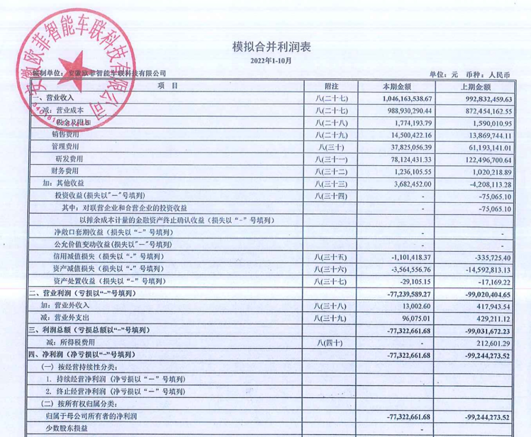根据此前公开披露的安徽欧菲主体合并后的模拟资产负债表显示,截止2022年10月31日,安徽欧菲总资产为13.89亿元,负债合计8.13亿元。2022年1-10月安徽欧菲实现营业收入10.46亿元,同比仅增长5.33%;净利润为亏损7732.27万元,上年同期为亏损9924.43万元。