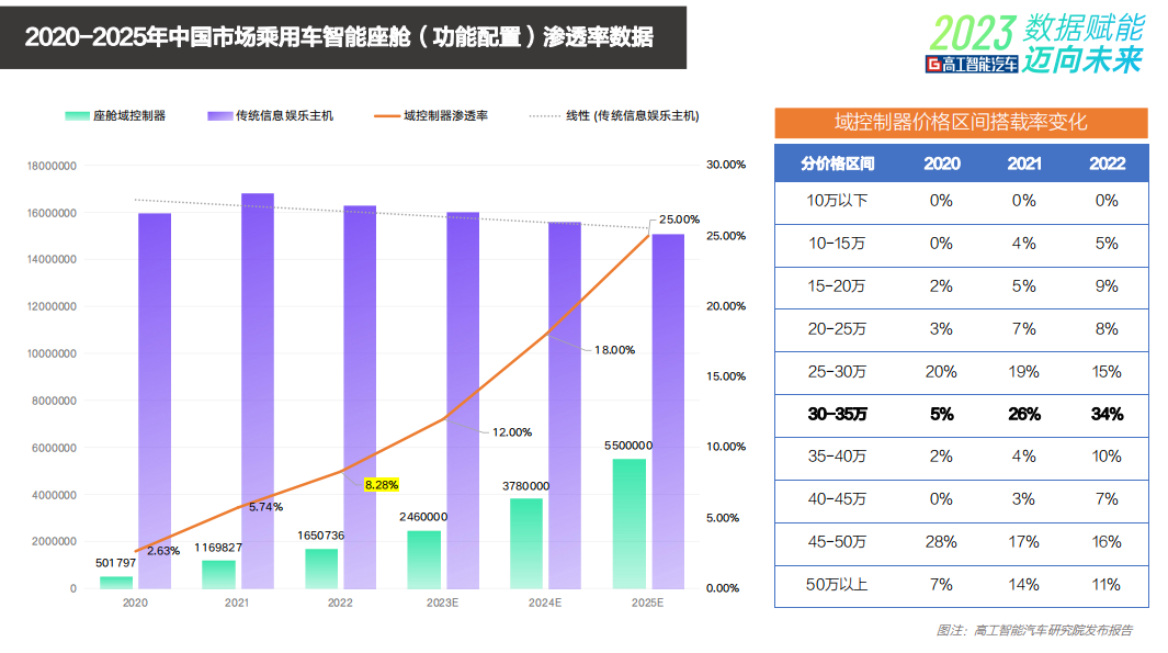 高工智能汽车研究院认为,座舱域控在短期内的渗透率或不会迎爆炸性增长,但会呈非常明确的上升趋势,预期2023-2025年的座舱域控渗透率分别为12%、18%、25%。