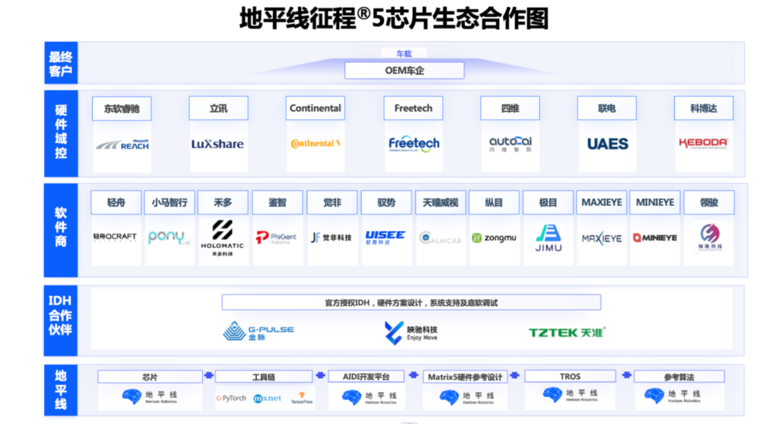 在征程5生态合作的构建上,自下而上来分层次看,在IDH(原始设计商 / 独立设计公司)包括金脉电子、映驰科技、天准科技等,提供硬件方案的设计、系统支持和底软调试等;软件商包括轻舟智航、禾多科技、觉非科技等,提供感规控等软件能力;硬件域控方面,包括立讯、福瑞泰克、联电等。