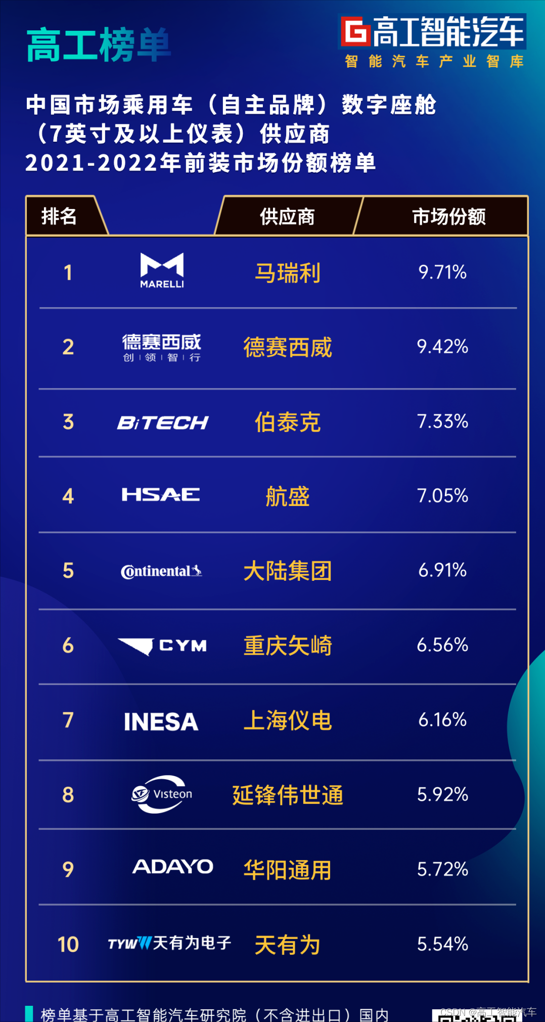 而在自主品牌车型搭载数字座舱(7英寸及以上液晶仪表)的供应商方面,马瑞利、德赛西威、伯泰克排名2021-2022年乘用车前装标配市场份额前三位。