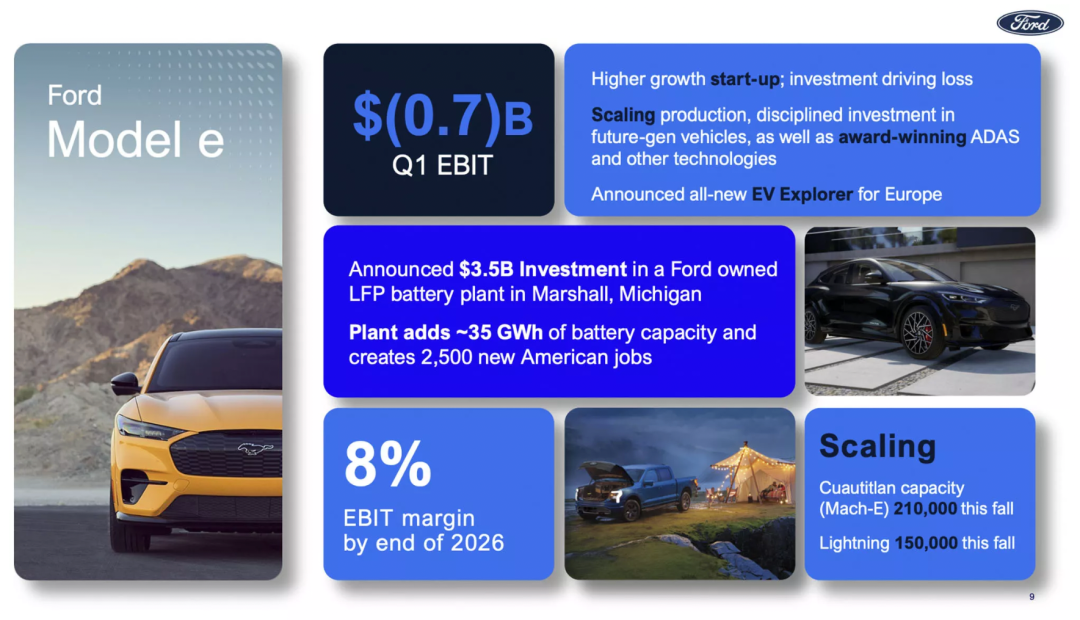 此外,在利润方面,一季度电动汽车业务亏损7.22亿美元,按照销量测算,每售出一辆电动汽车平均亏损58333美元。福特预计全年电动汽车业务亏损将达到约30亿美元。这其中,部分工厂的停工以及投入资金用于2025年生产下一代电动皮卡,也是影响因素之一。