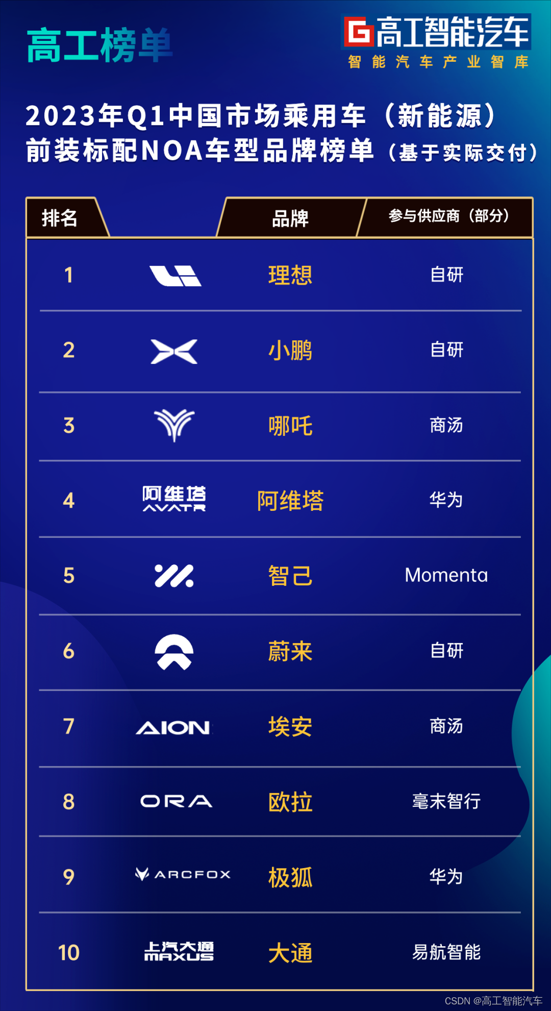 高工智能汽车研究院监测数据显示,2023年1-3月中国市场(不含进出口)新能源乘用车标配NOA交付前十名,依然是清一色的自主品牌。在算法及软件供应商方面,除了部分自研,包括商汤、华为、Momenta、毫末智行、易航智能等多家供应商已经榜上有名。