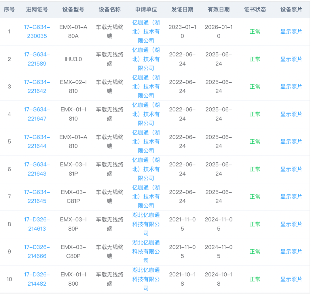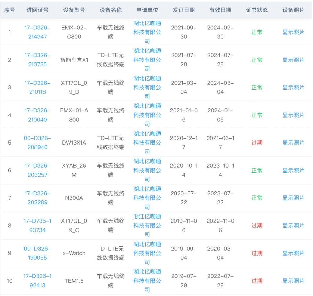 部分供应商车载无线终端(主机/T-Box)入网许可批复