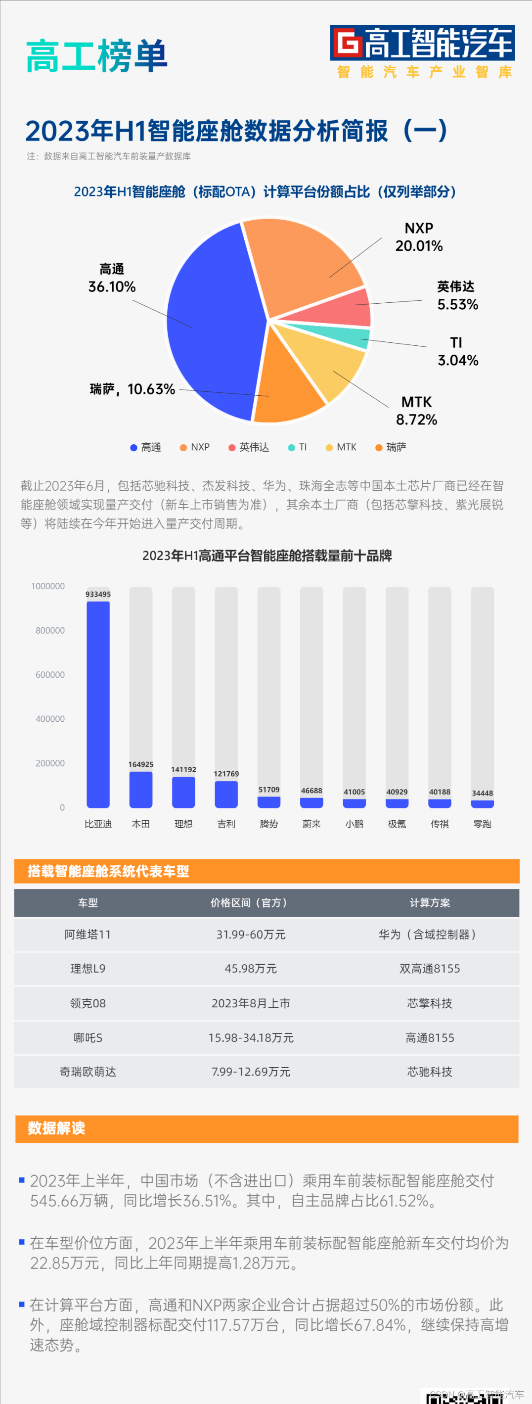 同期,高通平台(包括多款不同型号)的整体交付量达到236.33万辆,占整个智能座舱(中控娱乐、语音交互、车联网+OTA)市场的比重为36.10%,领跑市场(NXP已经把榜首位置拱手相让)。