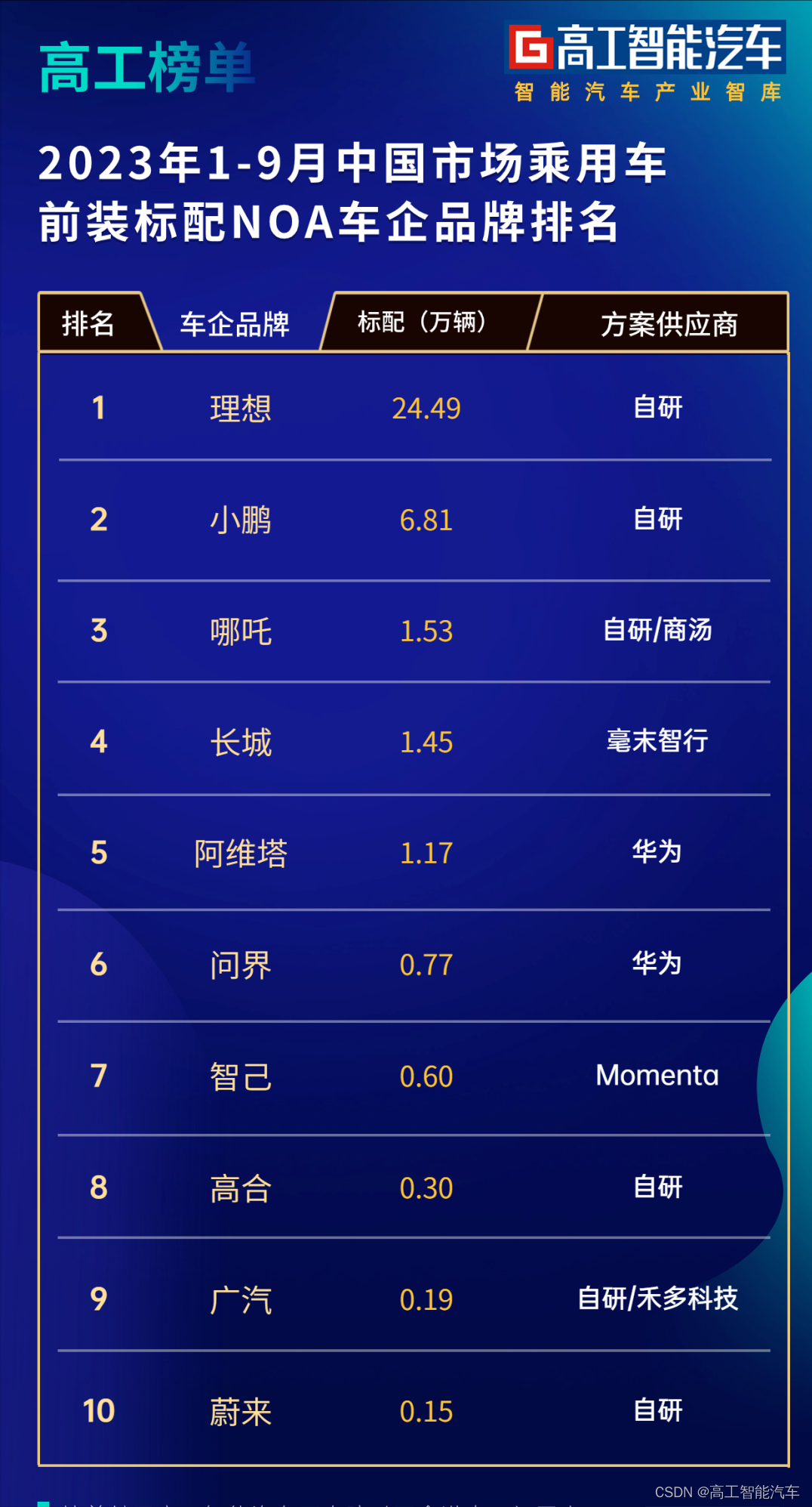 高工智能汽车研究院最新发布数据显示,2023年1-9月,中国市场(不含进出口)乘用车前装标配(软硬件)NOA交付新车37.73万辆,同比上年同期增长151.20%。