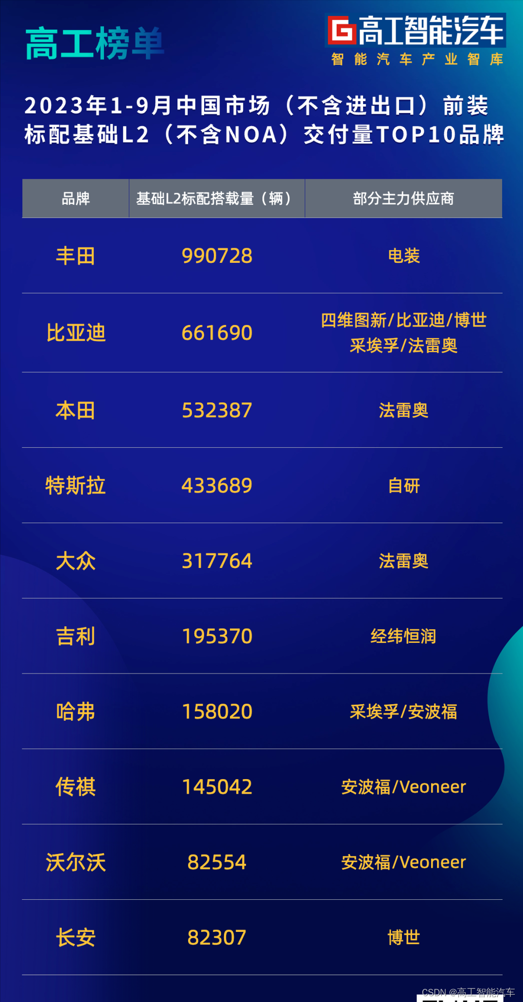 高工智能汽车研究院监测数据显示,2023年1-9月,基础L2在中国市场(不含进出口)乘用车前装标配交付453.24万辆,同比增长26.96%,增速和上年同期相比下滑约35个百分点。