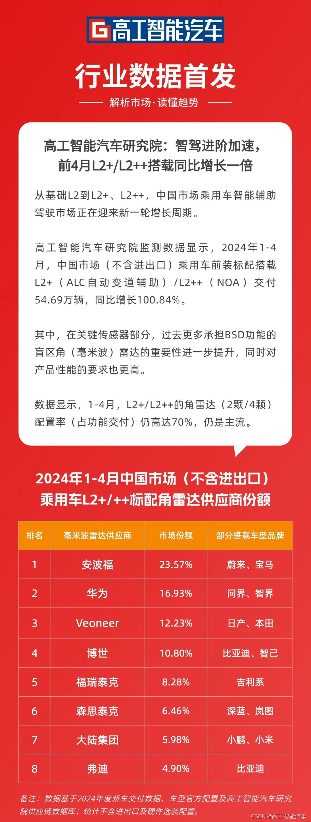 数据显示,1-4月,L2+/L2++的角雷达(2颗/4颗)配置率(占功能交付)仍高达70%,仍是主流。