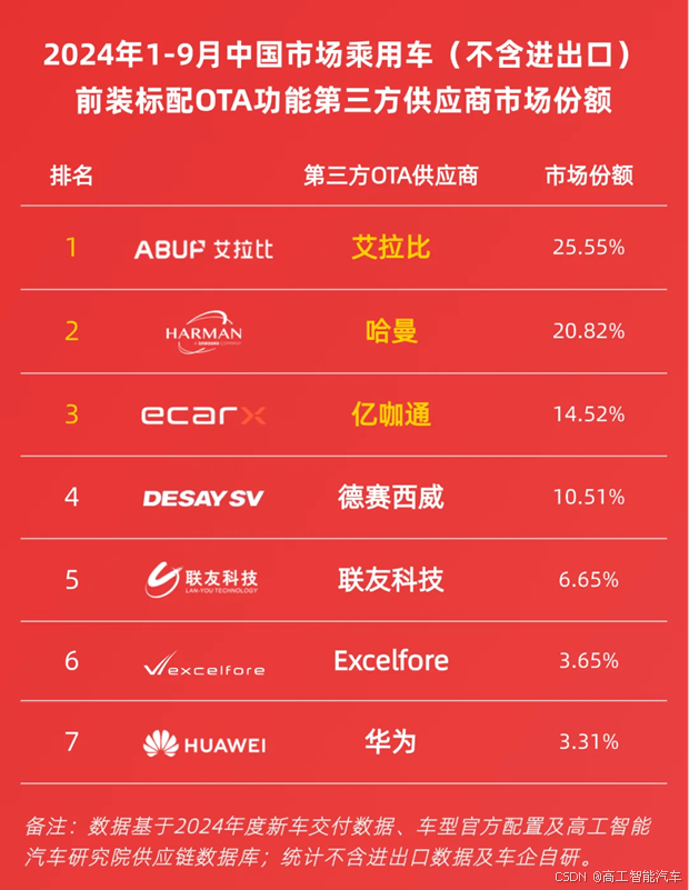 日前,高工智能汽车研究院发布2024年1-9月中国市场乘用车前装标配OTA功能第三方供应商市场份额榜单,艾拉比以25.55%的市场占有率排行榜首。自2021年高工智能汽车研究院首次发布第三方OTA供应商前装交付量排行榜单以来,艾拉比已连续4年成为OTA第三方供应商榜单第一。