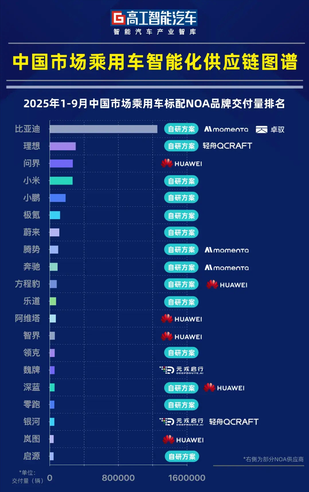 本周,高工智能汽车研究院发布报告称,2025年9月,中国市场(不含进出口)乘用车前装标配NOA(含高速、城区)搭载率升至29.15%,单月上车交付首次突破60万辆。