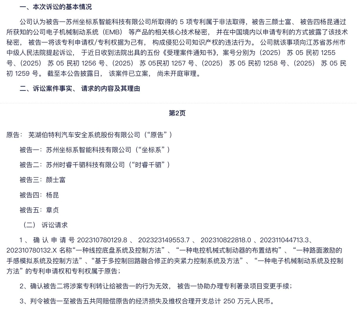 11月底,上市公司伯特利发布公告,起诉苏州坐标系所取得的5项专利属于非法取得,被告通过所获知的公司电子机械制动系统(EMB) 等产品的相关核心技术秘密,并在中国境内以申请专利的方式披露了该技术秘密。