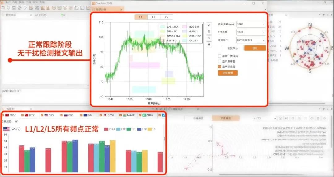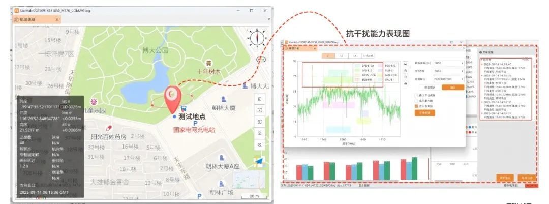 客户反馈的充电桩实际干扰场景测试,A720准确识别出了扫频干扰类型和干扰强度,并在此干扰场景下保持了固定解状态,且轨迹连续、精度正常,表现出了强大的抗干扰能力。
