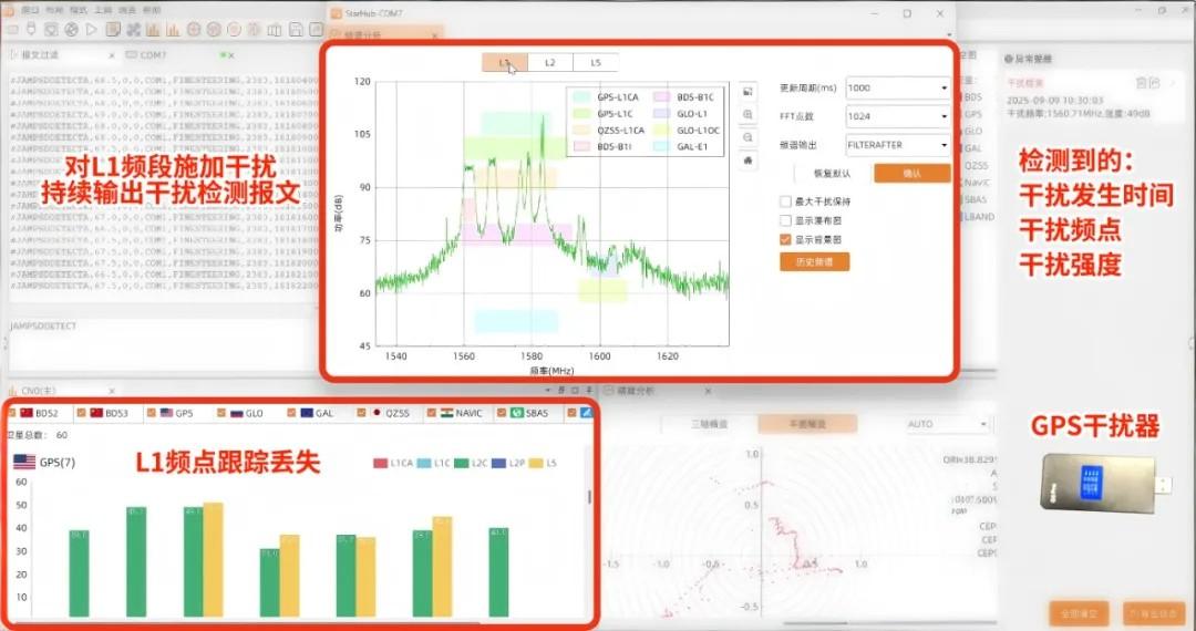 使用车载“点烟器式”GPS干扰器进行抗干扰测试,在A720正常运行过程中,开启干扰器,A720能够实时输出干扰检测报文,并准确地识别出干扰的类型、作用的频点和干扰型号的强度,为下游应用提供了可靠性的先验信息。