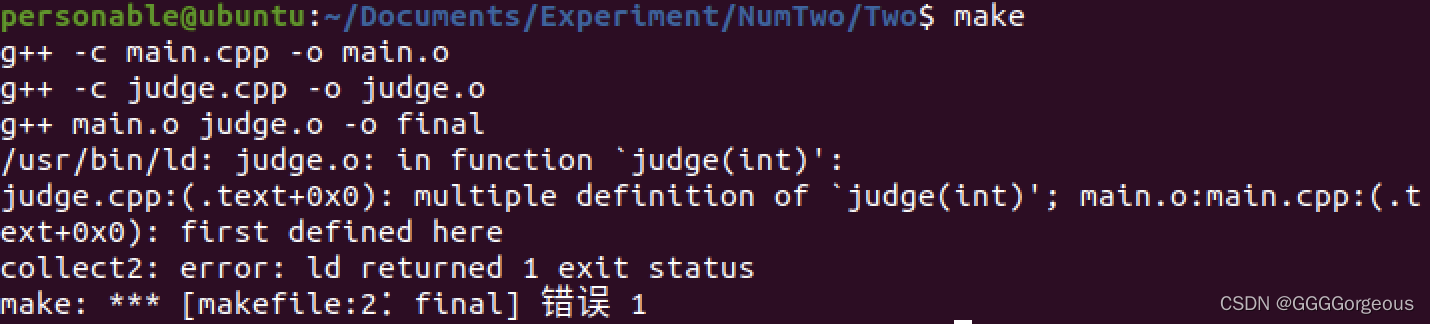问题的解决办法也很简单,只需要将main.cpp中包含的头文件#include“judge.cpp”改成#include“judge.h”即可,重新去执行make命令.