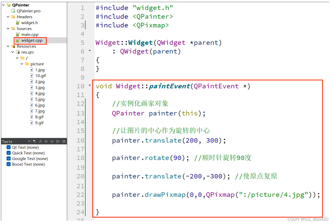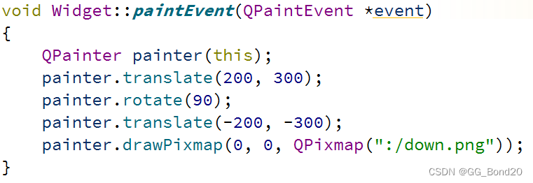 图片的旋转使用的是 QPainter类 中的 rotate()函数,默认是以原点为中心进行旋转的。若要改变旋转的中心,可以使用translate()函数完成