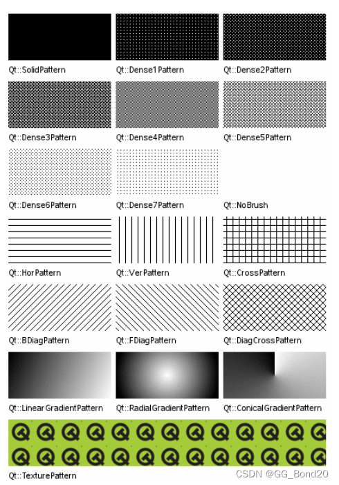 在 Qt 中,画刷是使用 QBrush类 来描述,画刷大多用于填充。QBrush定义了QPainter的填充模式,具有样式、颜色、渐变以及纹理等属性