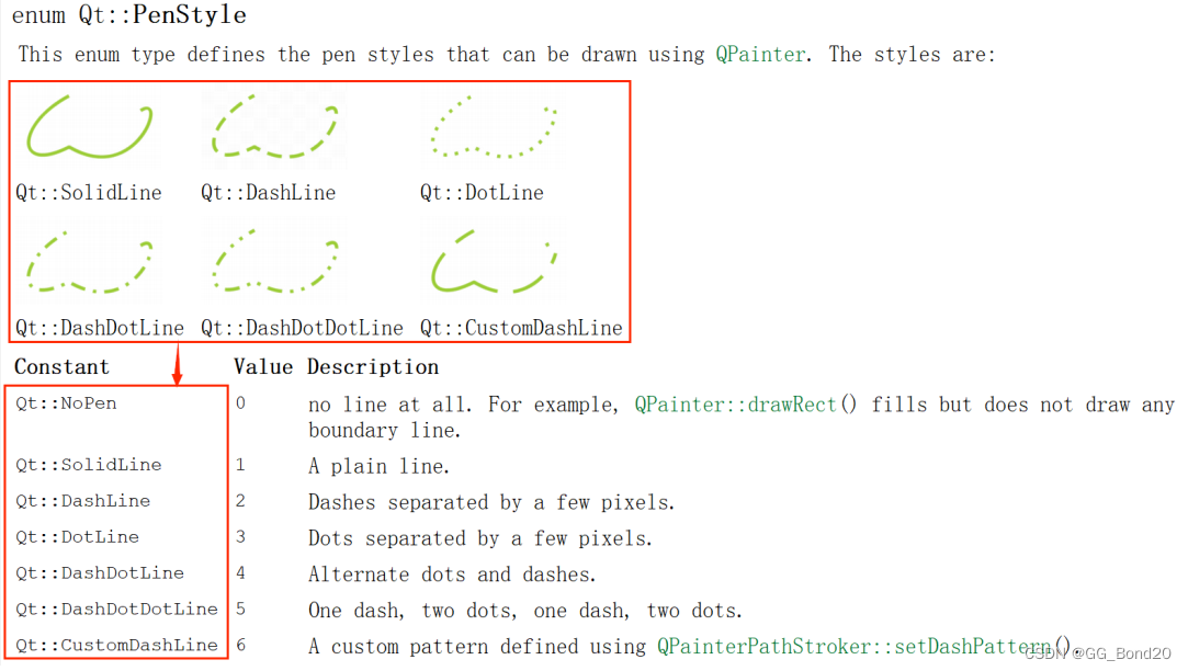 - 设置画笔风格:void QPen::setStyle(Qt::PenStyle style)