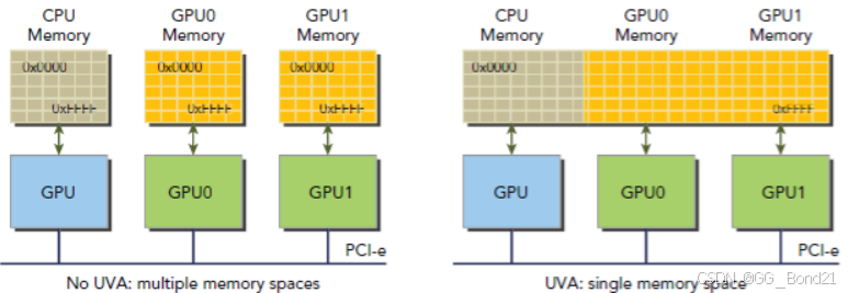 在UVA之前,需要分别管理指向 host memory 和 device memory 的指针。使用UVA之后,实际指向内存空间的指针对用户来说是透明的,看到的是同一块连续地址空间