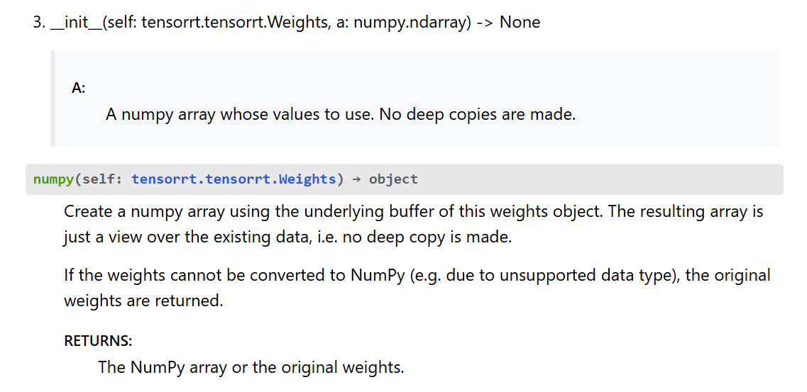 然后去查看读取权重部分的代码,numpy数组的值是没问题的,设置trt.Weights的代码也没有什么问题,但是将trt.Weights数据使用.numpy()再次转换为numpy数组后,打印出来的值就出现上面的那种情况