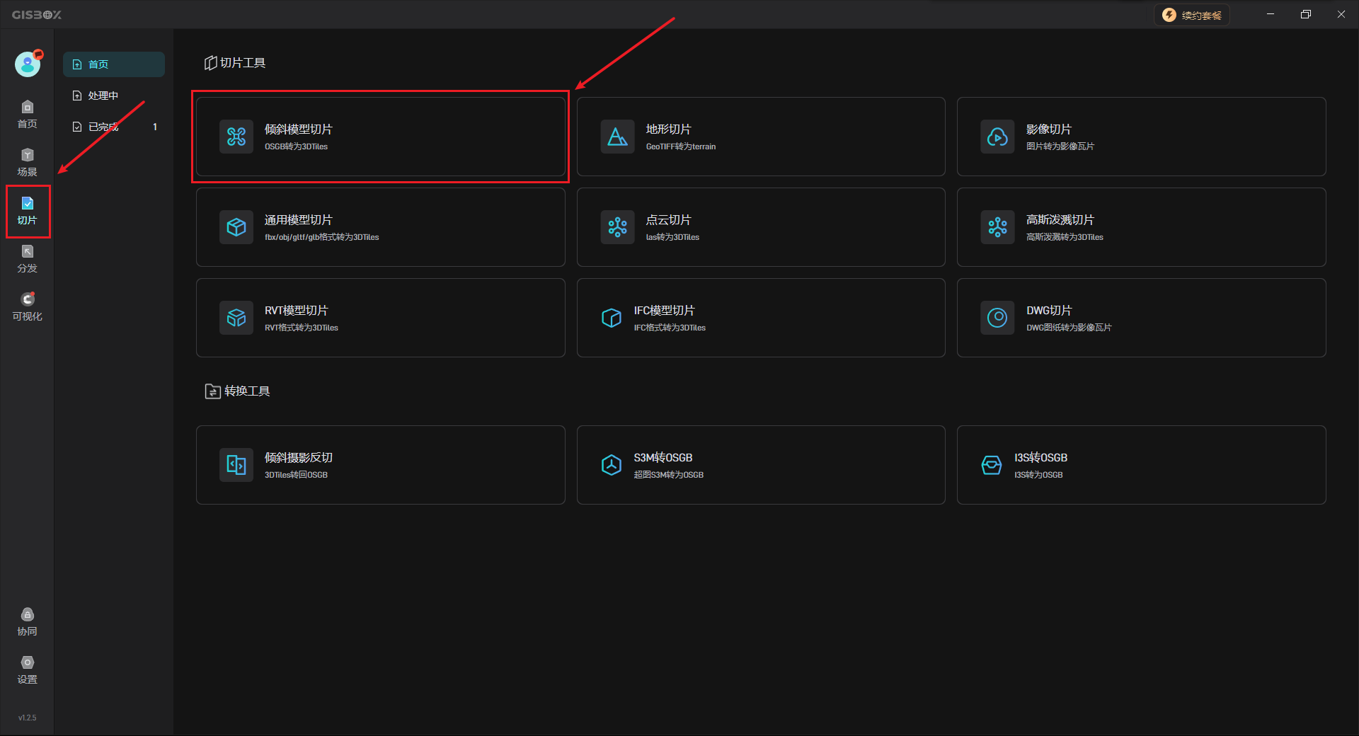 首先,在GISBox软件左侧选择“切片”,然后点击右侧的“倾斜模型切片”。