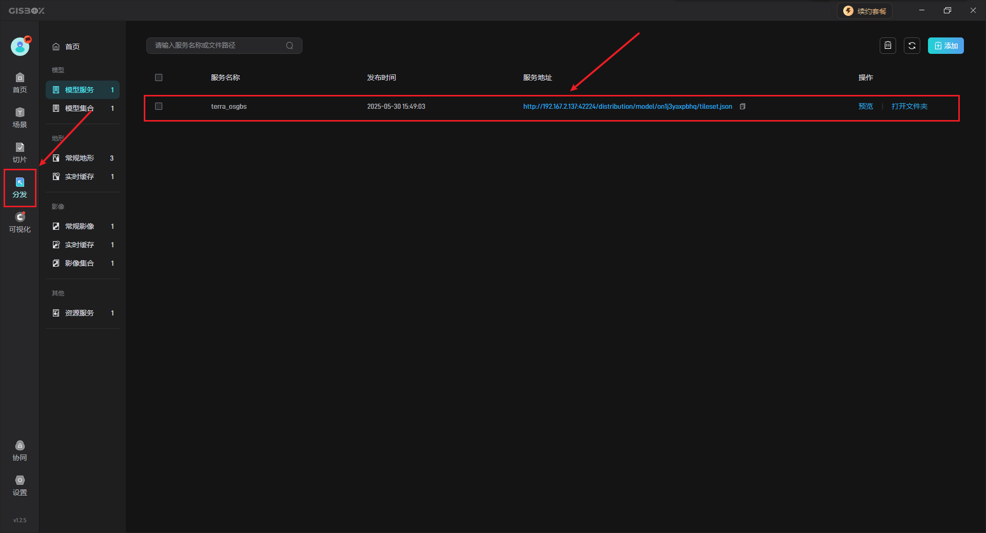 然后我们可以在“分发”中找到刚才切片完毕的文件,复制服务地址即可将其应用到Cesium、山海鲸可视化等平台中。