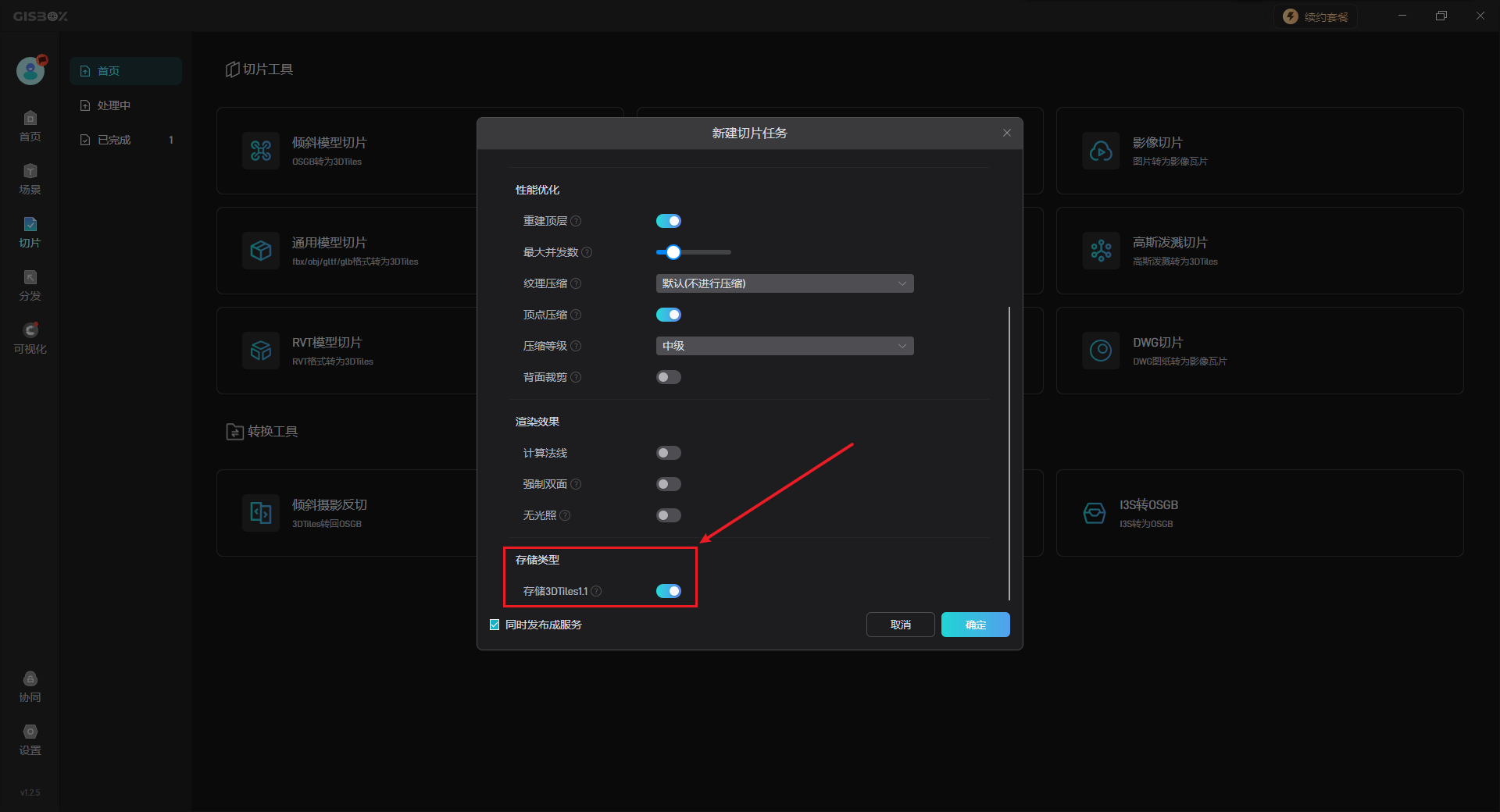 最后勾选“存储3DTiles1.1”,点击“确定”等待切片完毕即可。