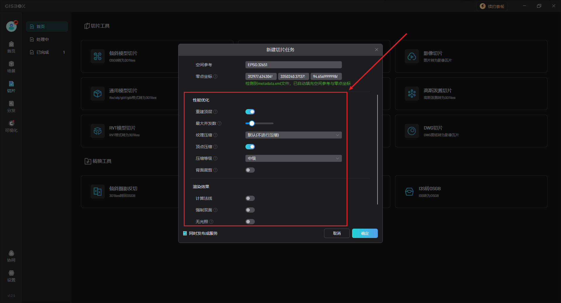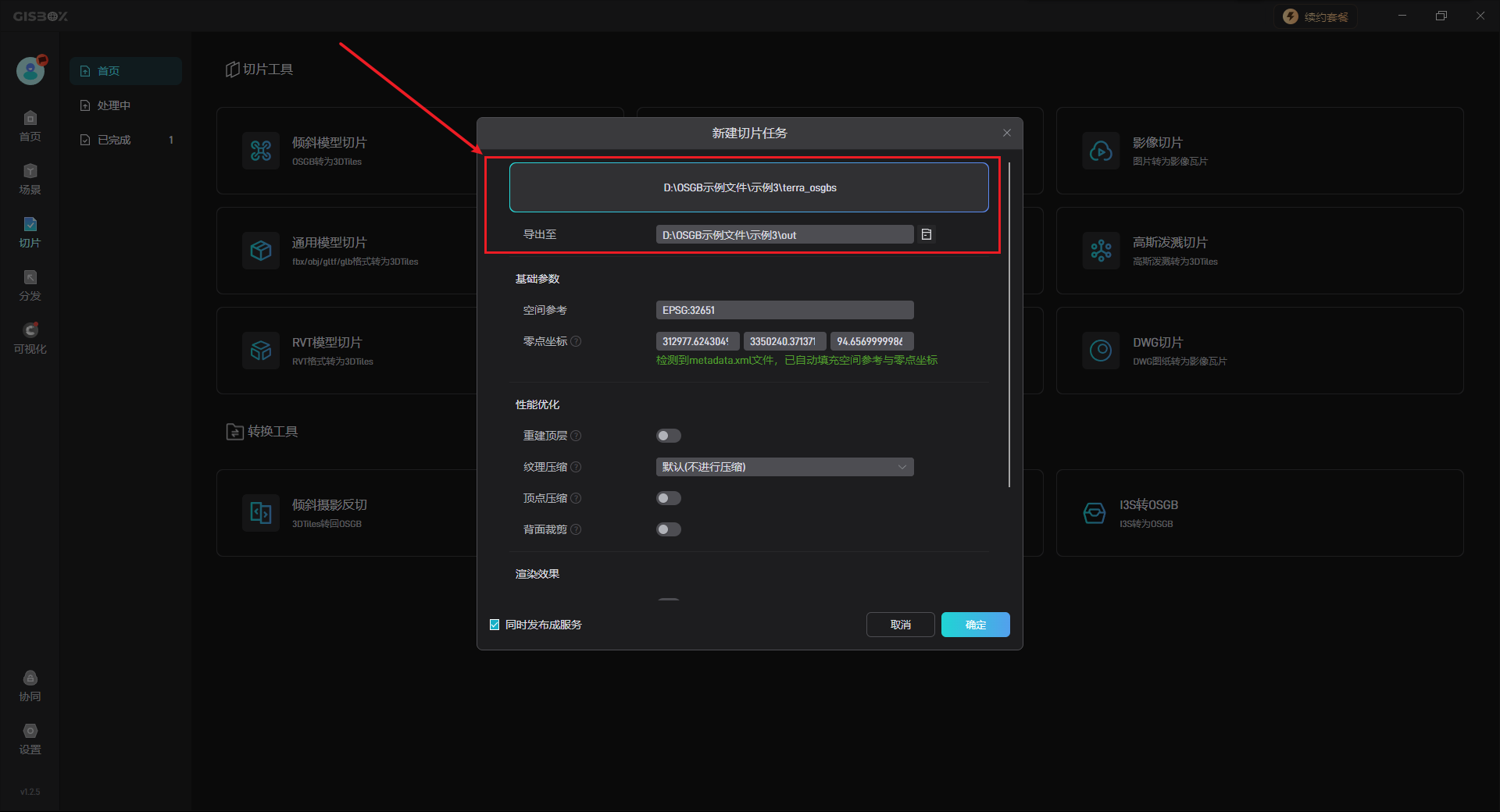 添加OSGB文件,然后可在“基础参数”中设置切片导出文件夹,“空间参考”和“零点坐标”会根据文件夹中的“metadata.xml”文件自动生成。