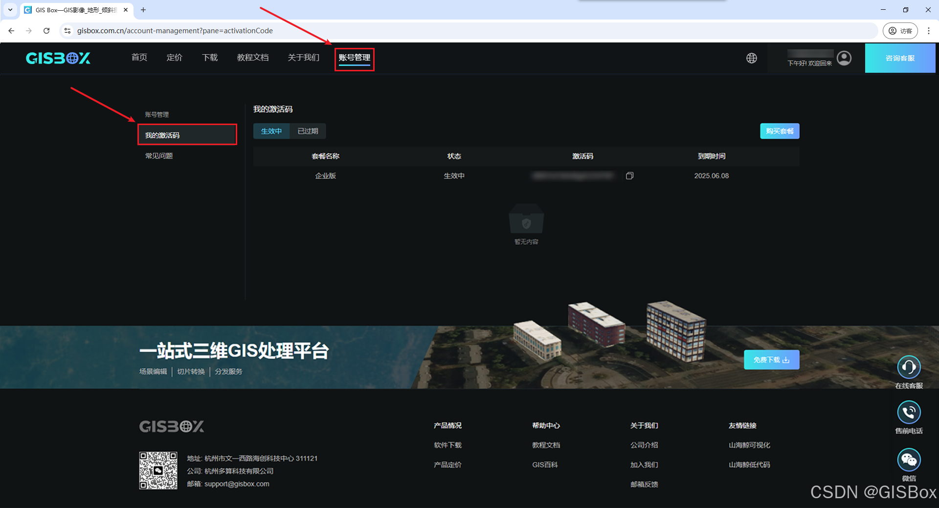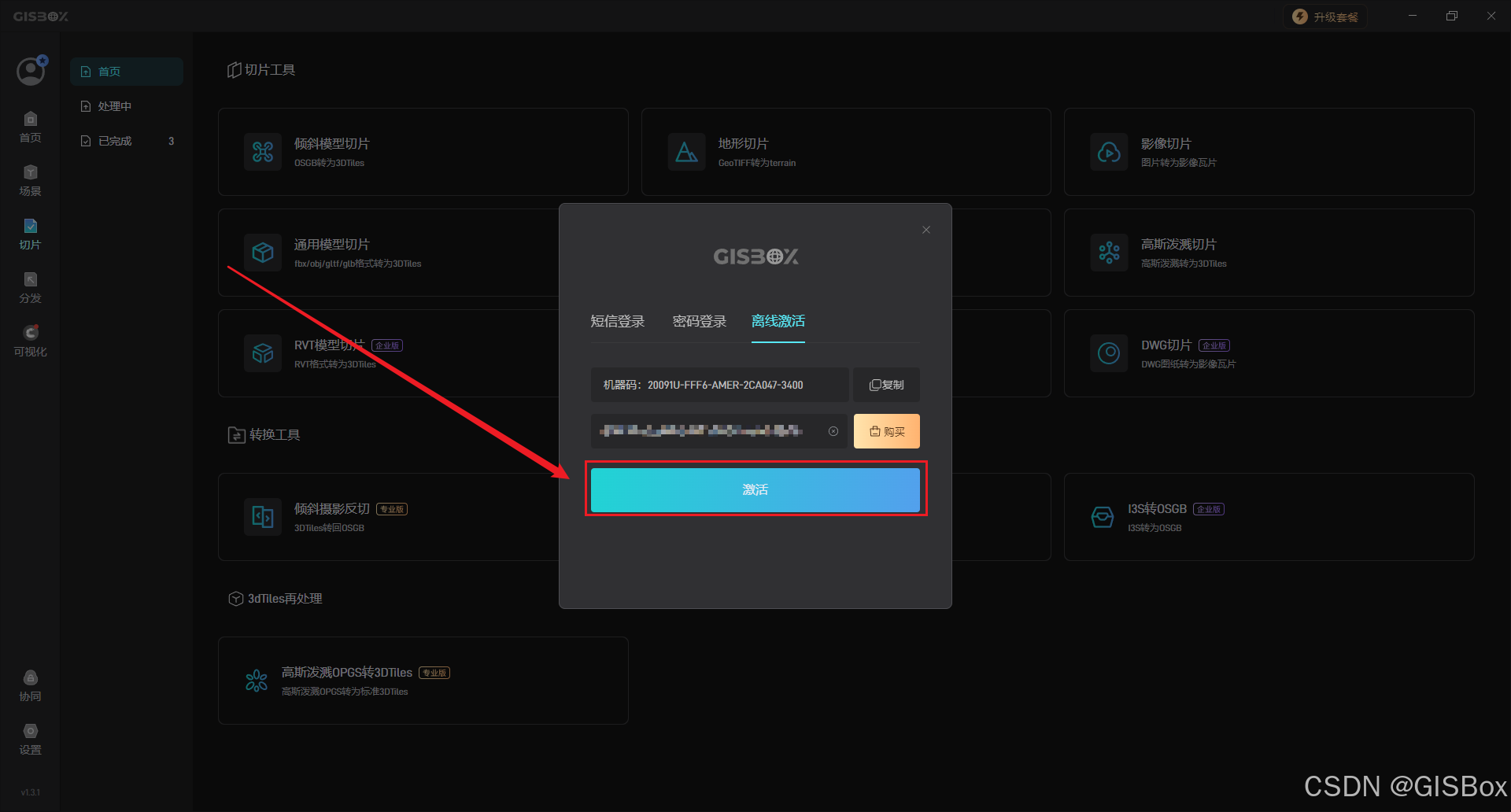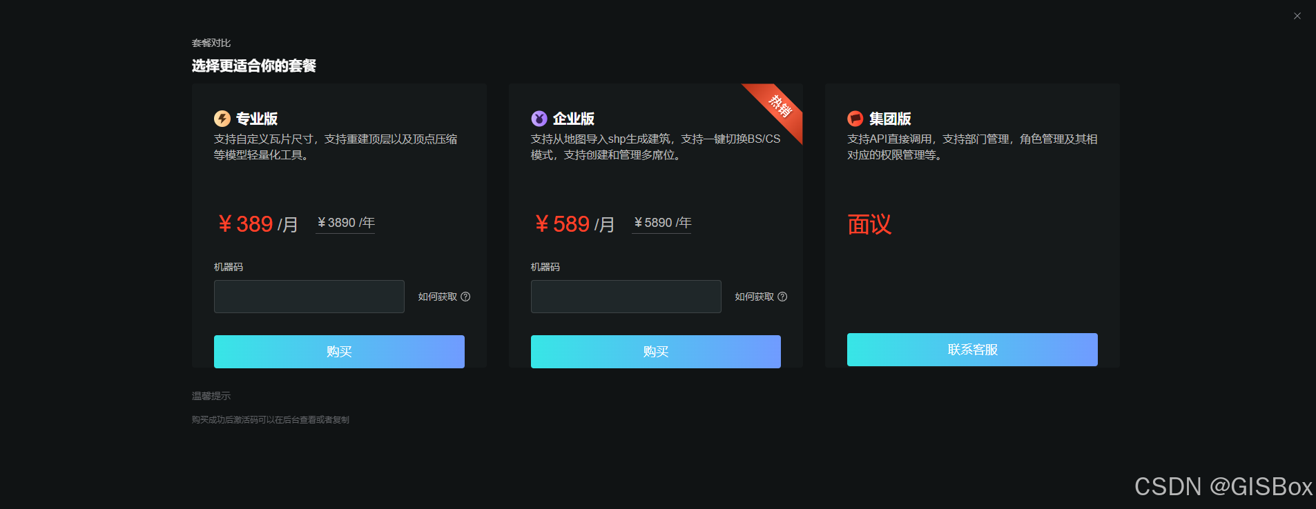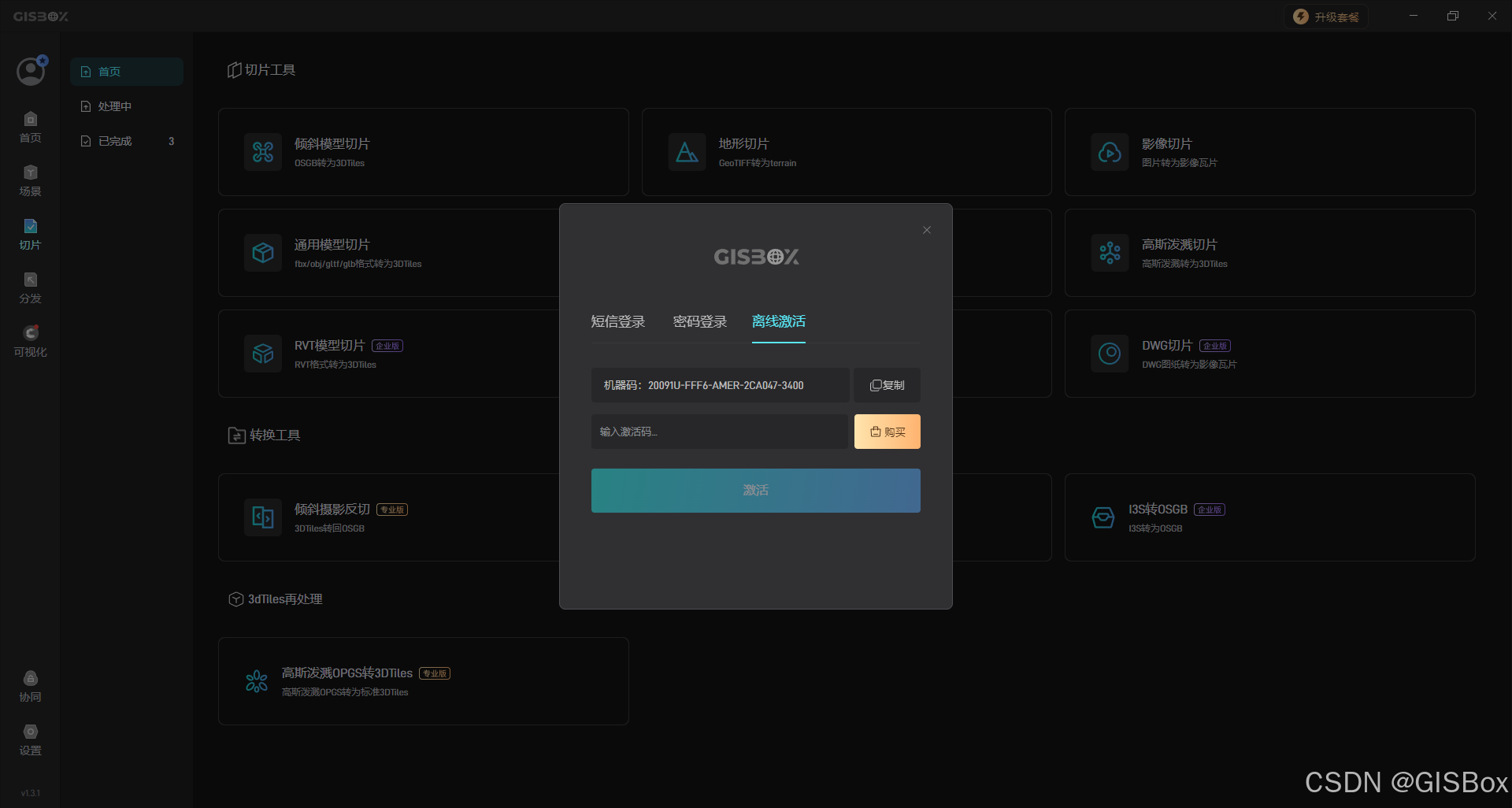 GISBox(GIS 工具箱)目前提供网络公开版和局域网离线版两种版本,其中局域网离线版需要先购买 License 激活码,然后输入激活码登录。