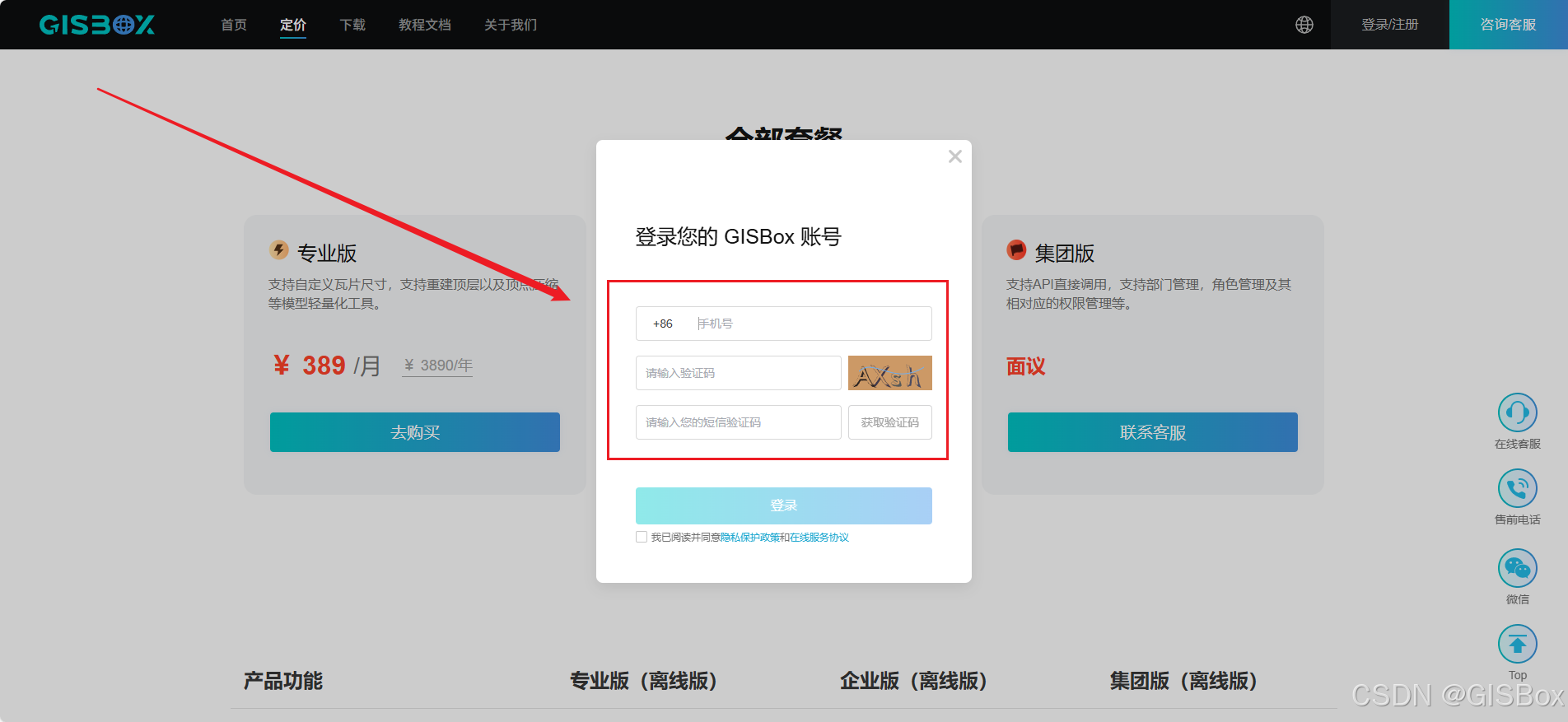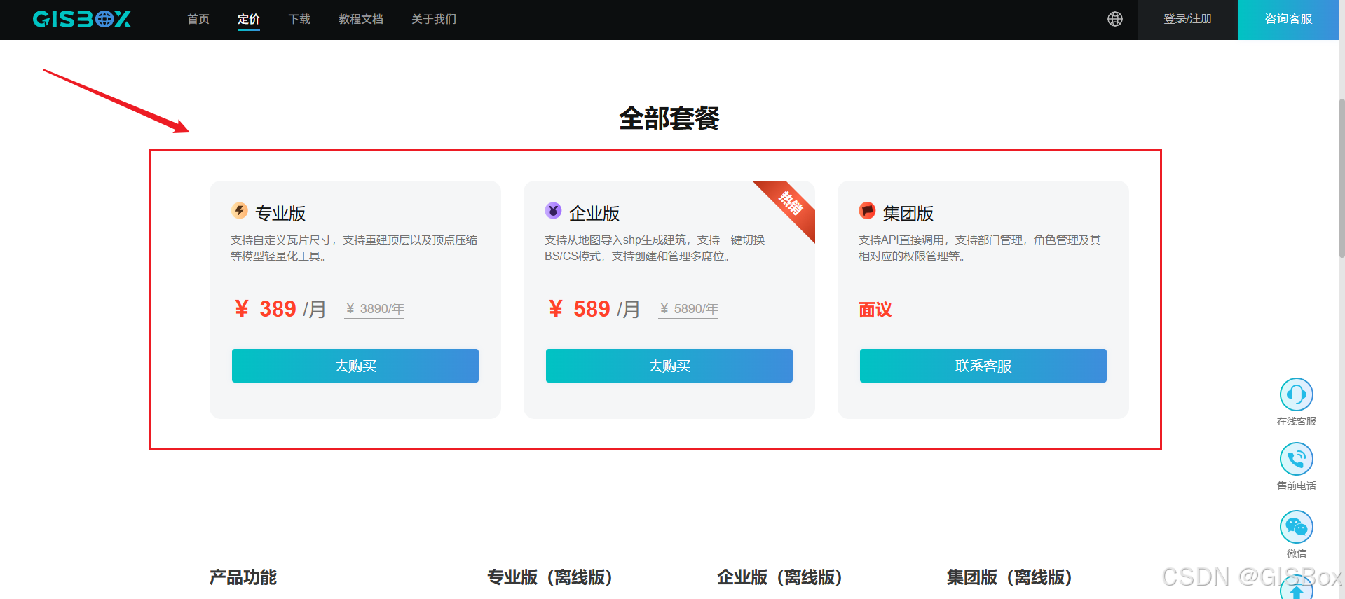 3、点击“购买按钮”,会弹跳到官网的“局域网离线版套餐”界面,点击“去购买”,此时会要我们登录GISBox官网账号。