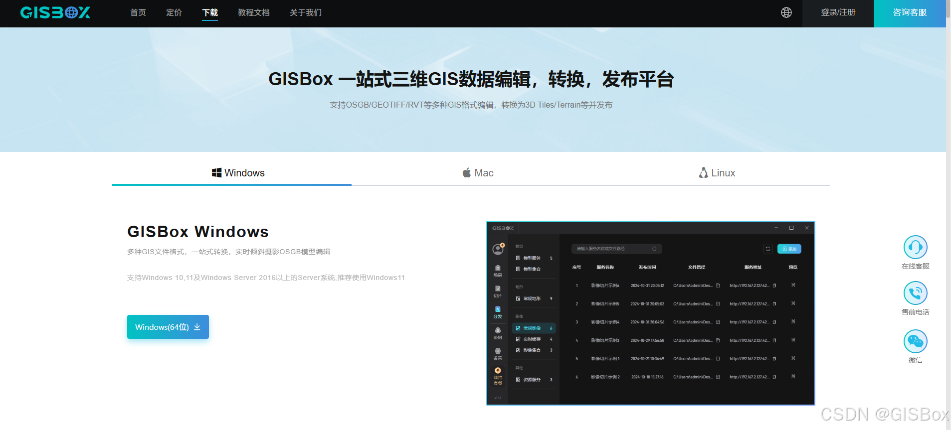 1、首先,打开GISBox官网,点击“下载”按钮,根据系统类型,选择合适的GISBox进行下载安装。