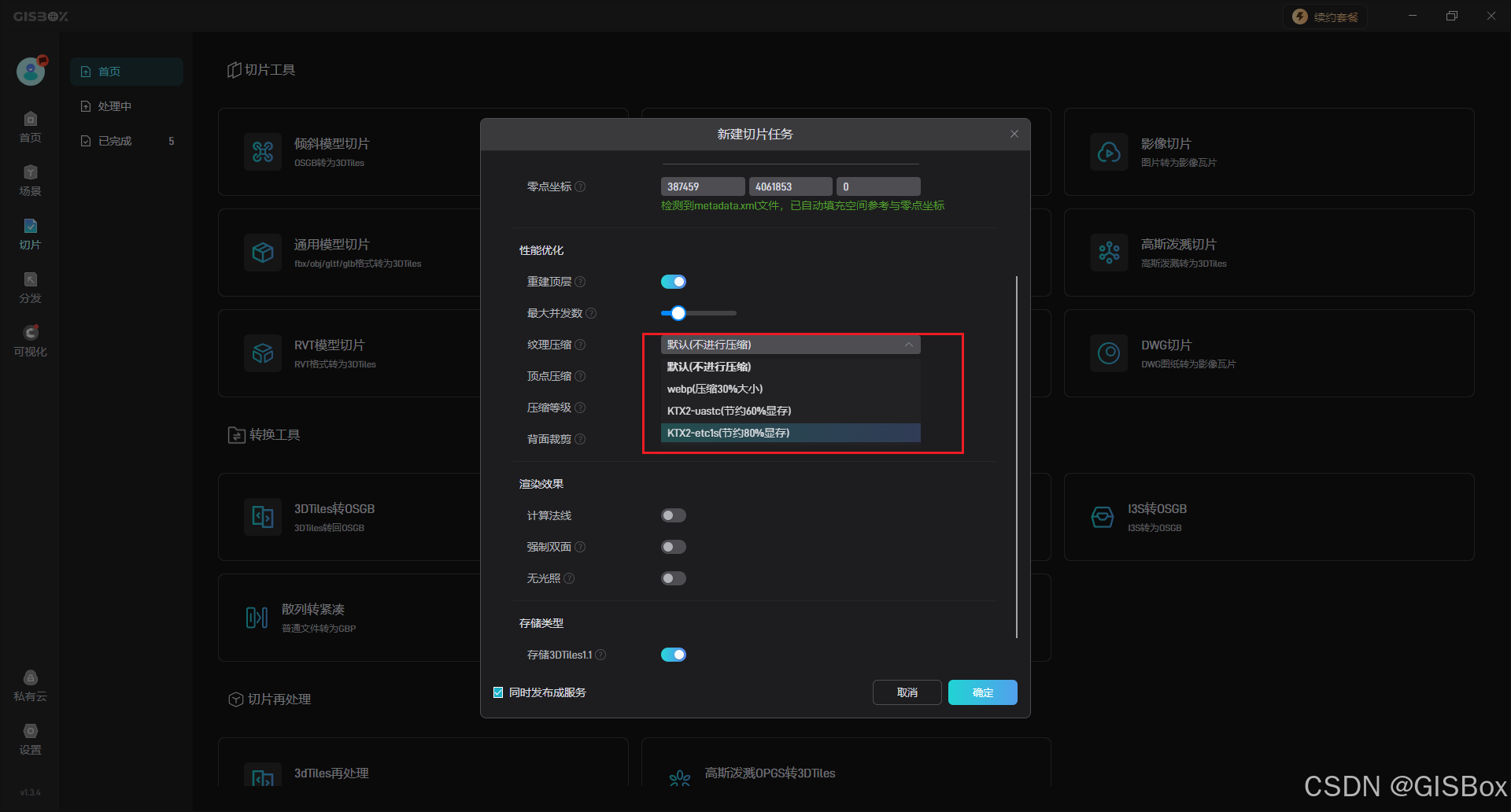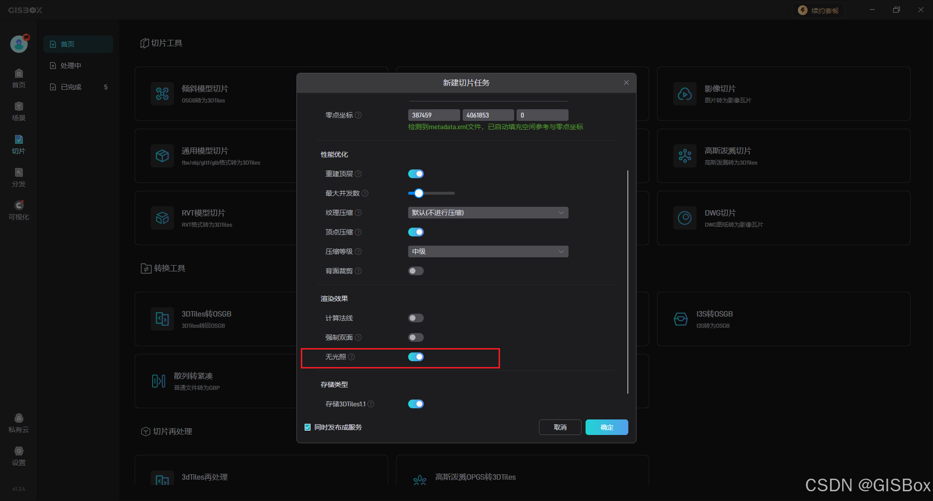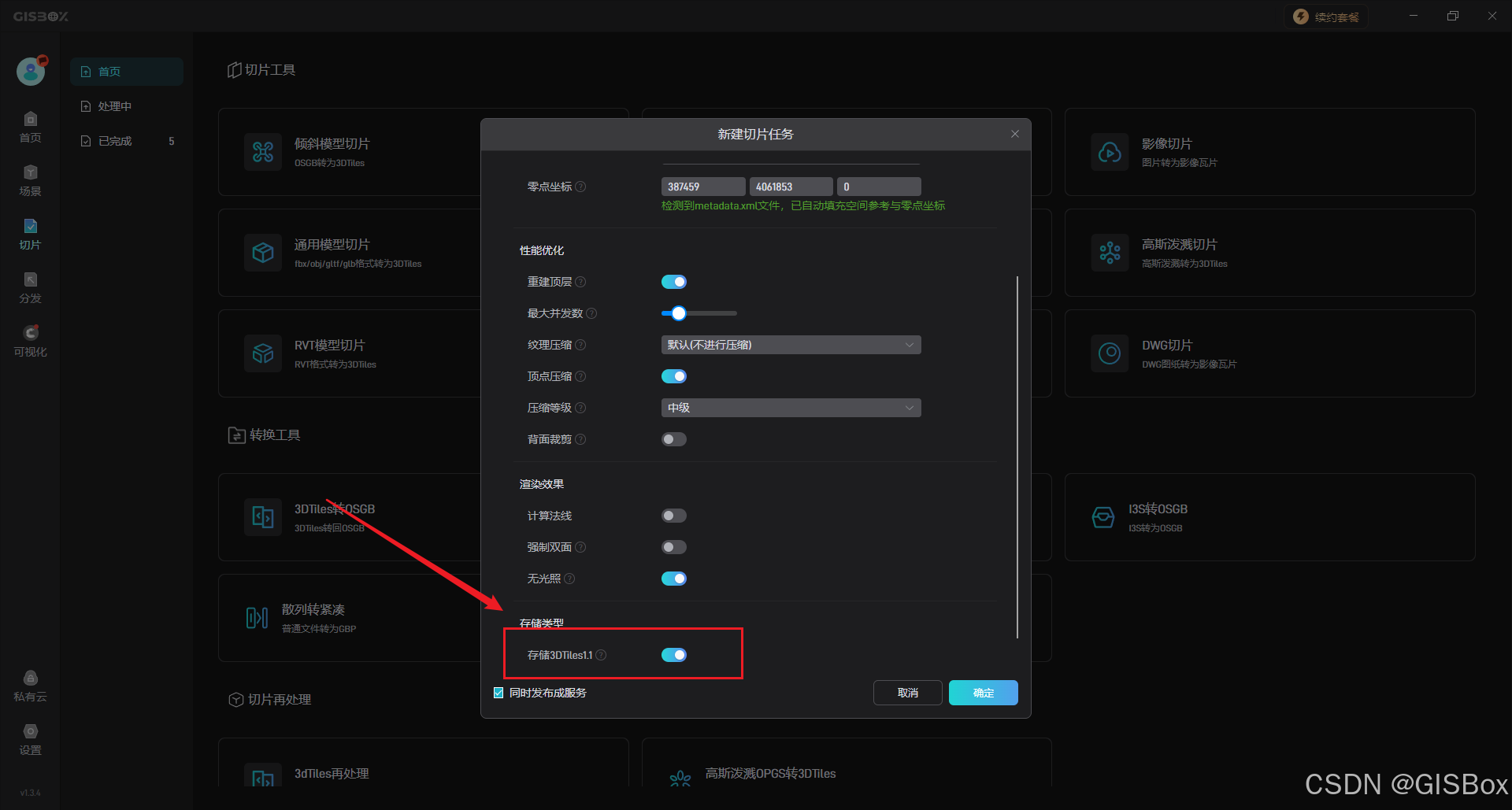 6、在“存储类型”中,默认开启“存储 3DTiles1.1”。开启时,OSGB(倾斜摄影)文件夹中的模型文件导出后为glb格式。关闭时则为b3dm格式。